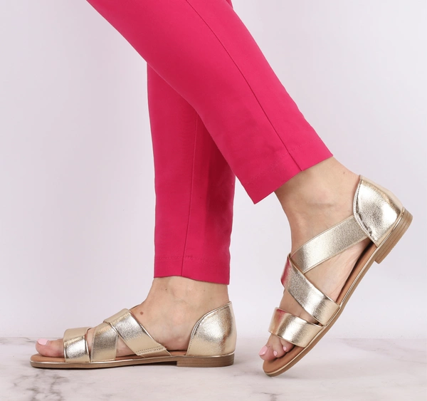 Złote płaskie sandały damskie z gumkami na krzyż i zabudowaną piętą Jezzi
