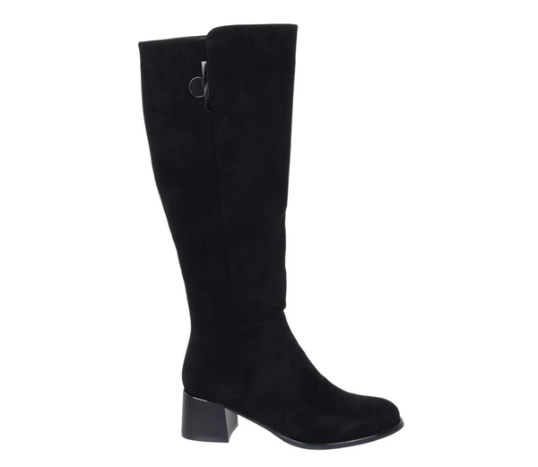 Czarne zamszowe kozaki damskie z szeroką cholewką na średnim obcasie Jezzi