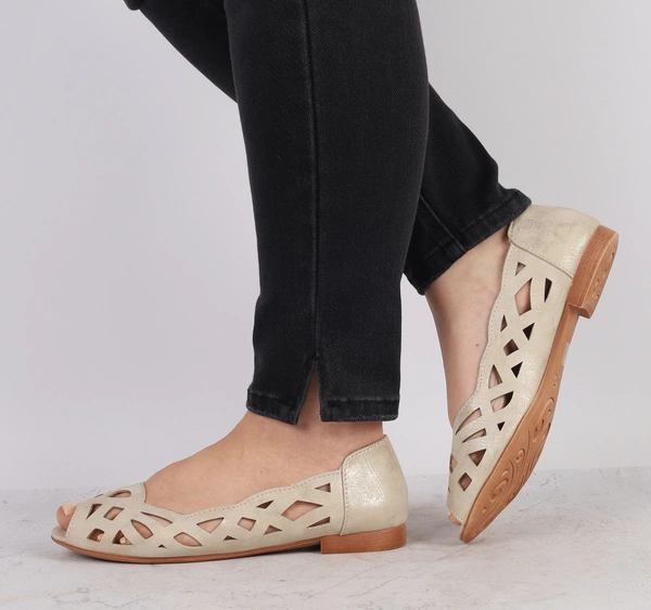 Złote wsuwane półbuty damskie ze skóry naturalnej dziurkowane Jezzi