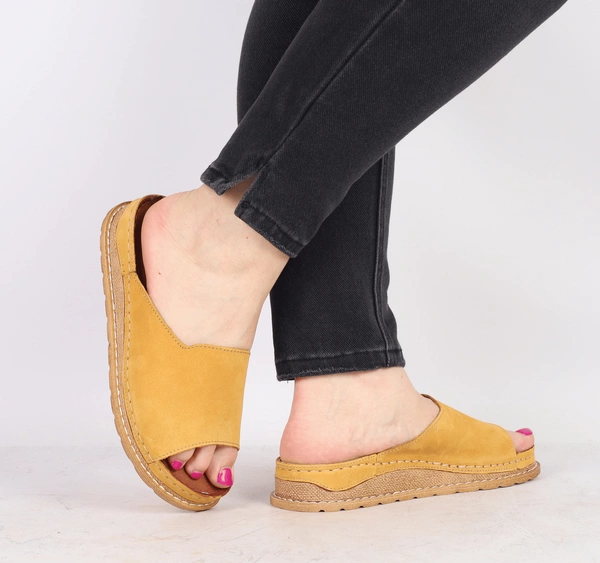 Musztardowe klapki damskie skórzane szyte w Polsce Gino Fabiani