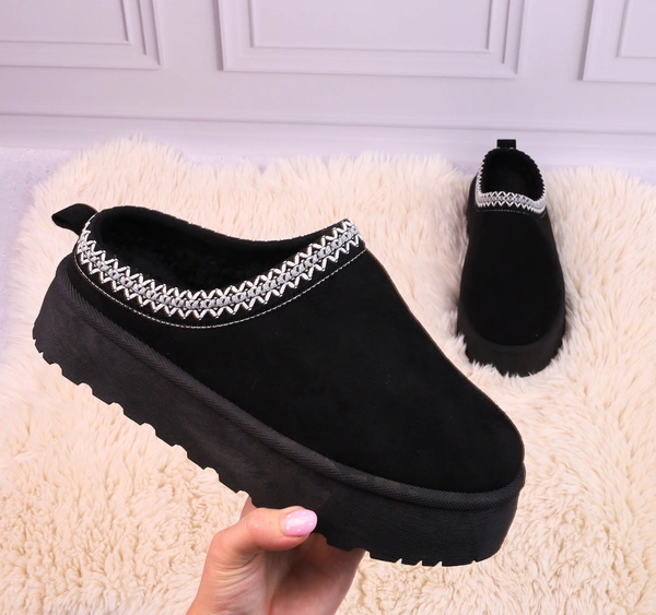 Czarne klapki zabudowane z futerkiem EMU na platformie ciepłe kapcie świąteczne na prezent
