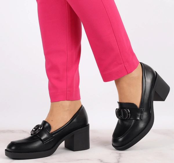 Czarne licowe półbuty na obcasie i platformie mokasyny z klamrą Jezzi