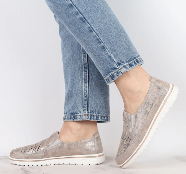 Złote wsuwane półbuty damskie ze skóry naturalnej dziurkowane Jezzi