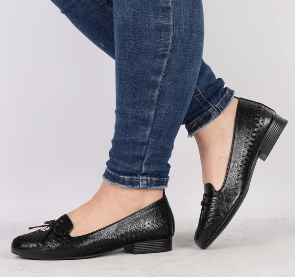 Czarne półbuty damskie wsuwane eleganckie z ażurową cholewką Jezzi