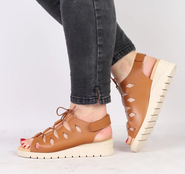 Jasnobrązowe sandały damskie eleganckie i wygodne na niskiej koturnie Helios