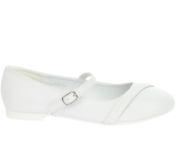 Białe czółenka komunijne płaskie zapinane na pasek American Club