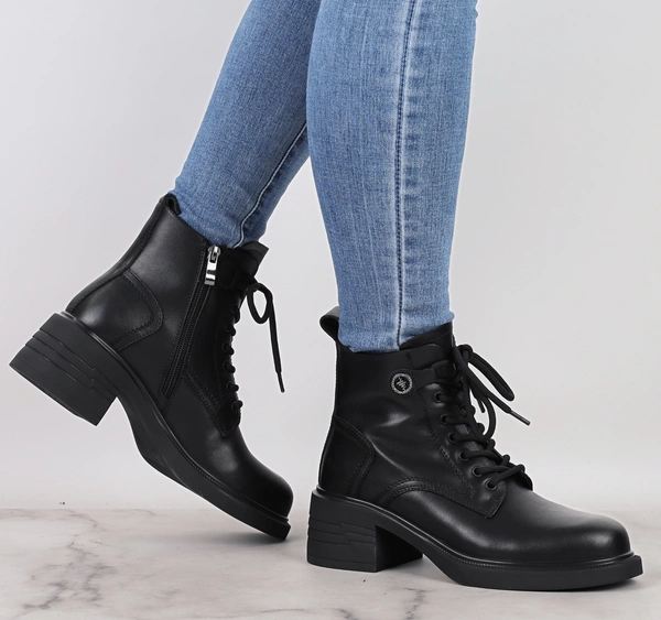 Czarne skórzane traperki rokowe ocieplane na zamek i sznurowadła Vinceza