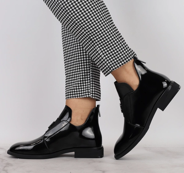 Czarne eleganckie botki płaskie ze skóry lakierowanej eko VINCEZA