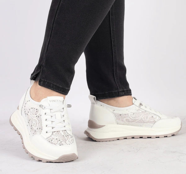 Białe adidasy damskie skórzane z koronką i cekinami VINCEZA