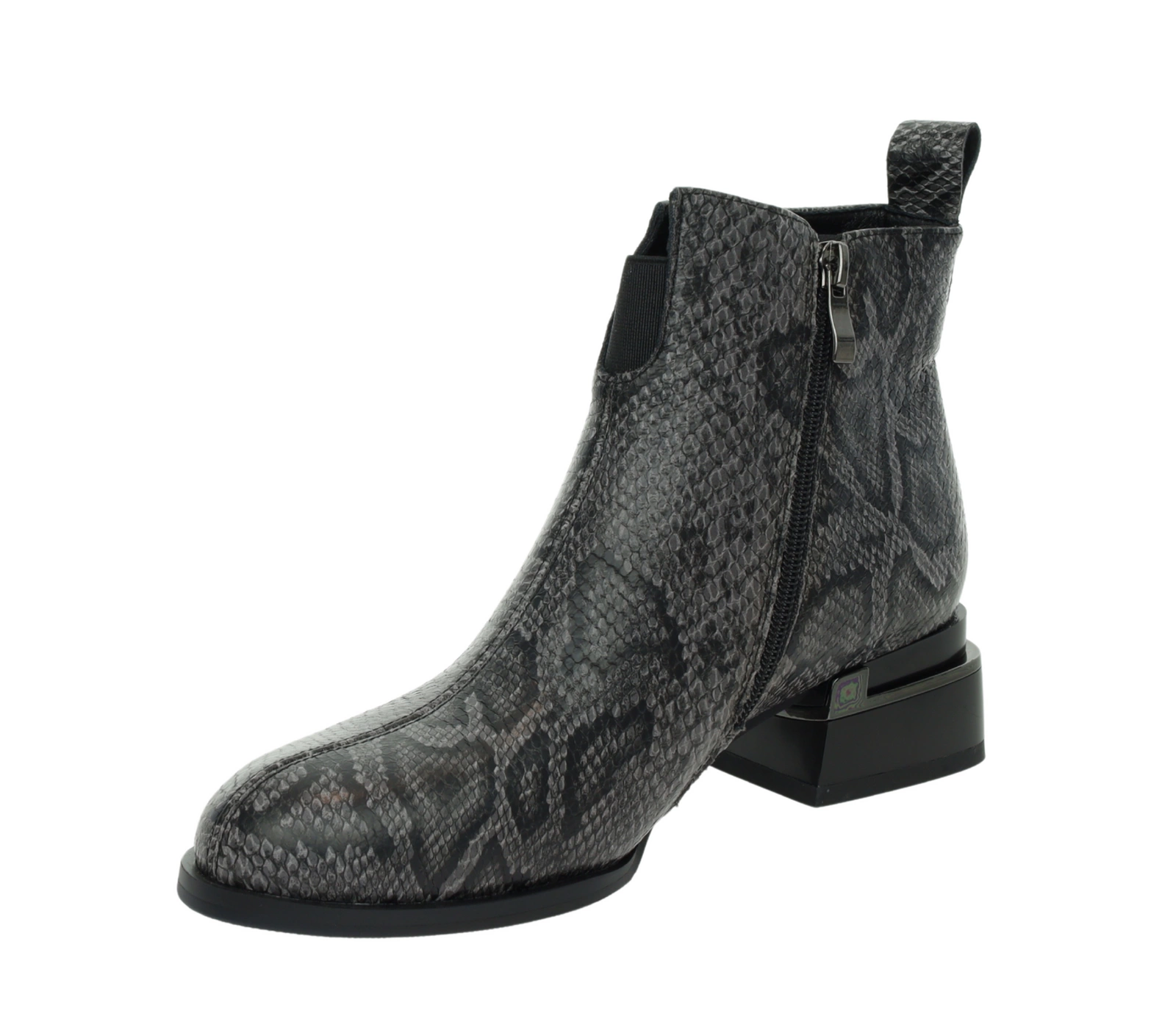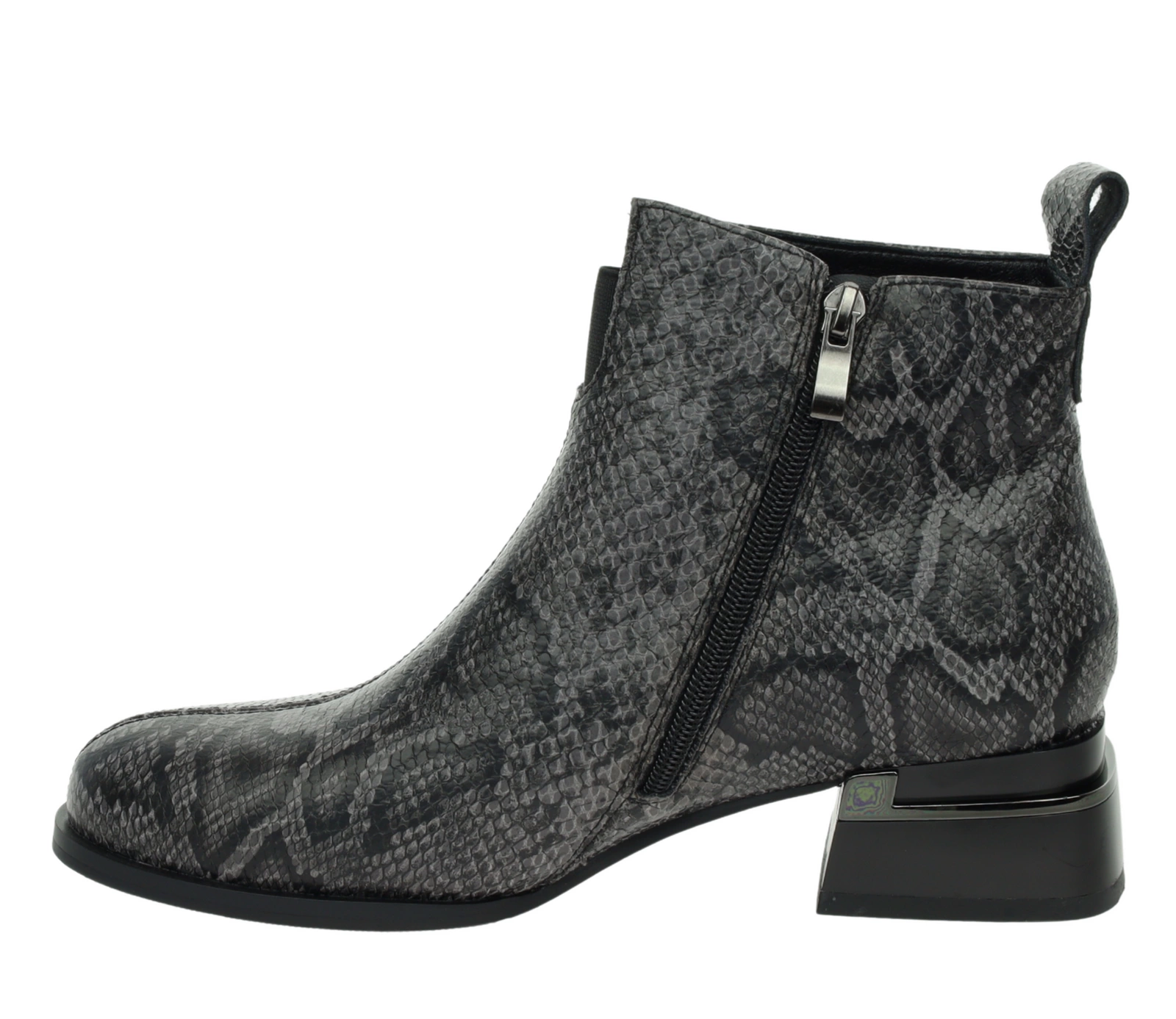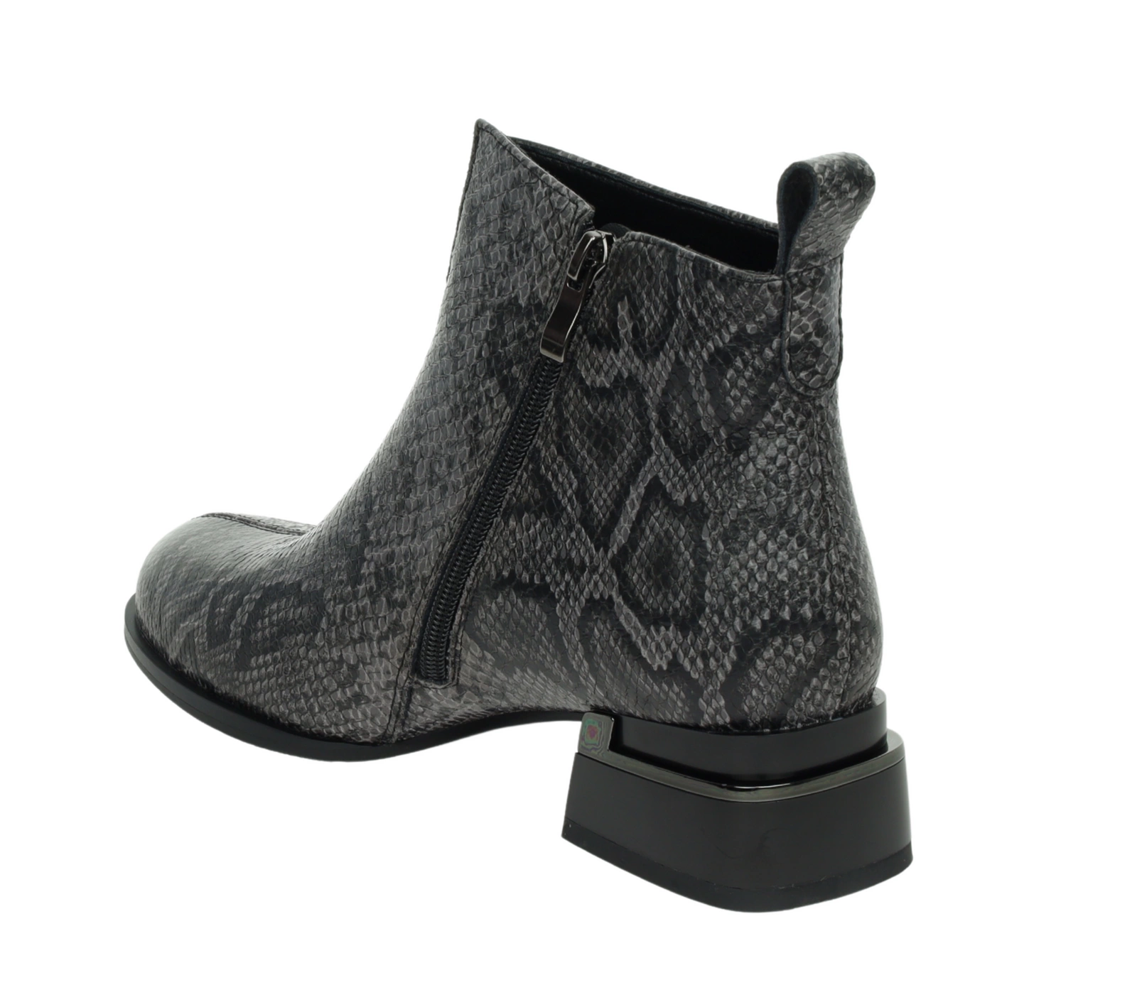 Zanurz się w subtelnej elegancji dzięki szarym skórzanym botkom z efektowną fakturą wężowej skóry. Wykonane z naturalnej skóry, z klasycznym, zaokrąglonym noskiem — te botki łączą komfort z luksusowym charakterem. Niski, stabilny obcas o wysokości 4 cm zapewnia wygodę przez cały dzień, a ocieplenie idealnie sprawdzi się w chłodniejsze dni. Elegancki zamek błyskawiczny gwarantuje łatwe zakładanie, a miękka, tekstylna wkładka dba o komfort stóp. To stylowy i praktyczny wybór — idealny do codziennych stylizacji i jesienno-zimowych wyjść.