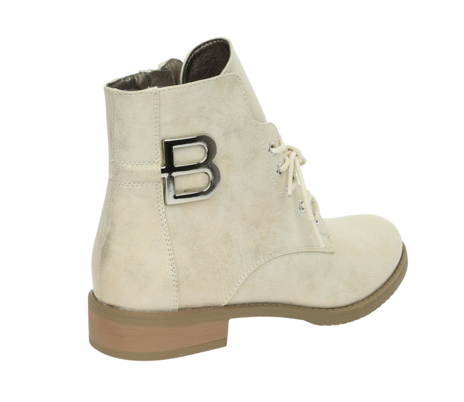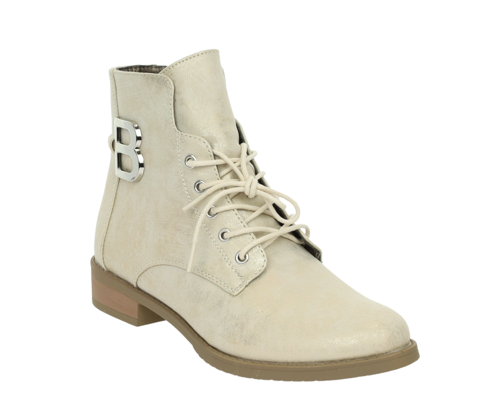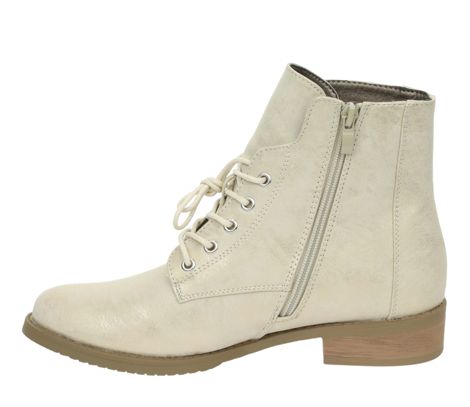 Beżowo-złote botki damskie jesienne ocieplane na płaskiej podeszwie Jezzi Złote botki marki Jezzi łączą klasyczny charakter z funkcjonalnością na co dzień. Stworzone z myślą o przyjemność noszenia, posiadają stabilną podeszwę.