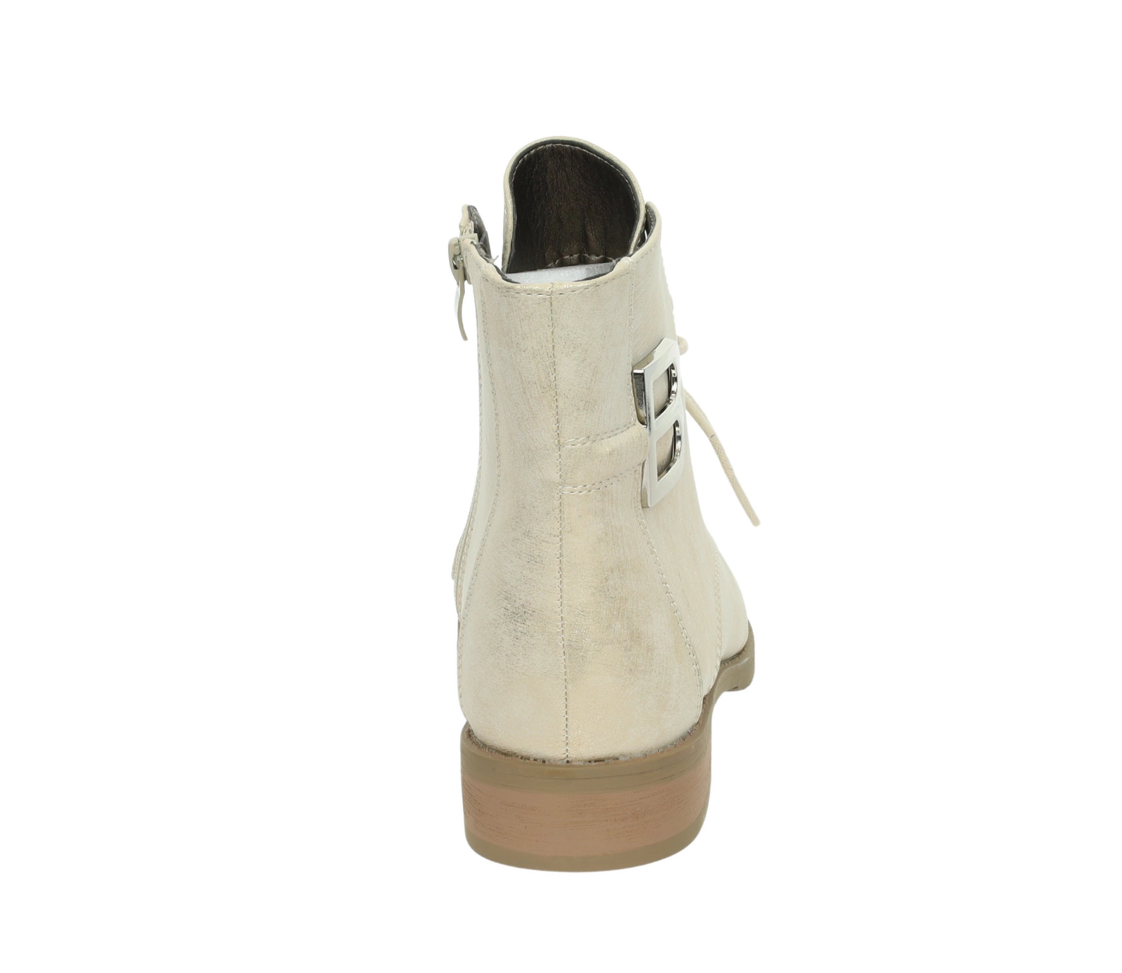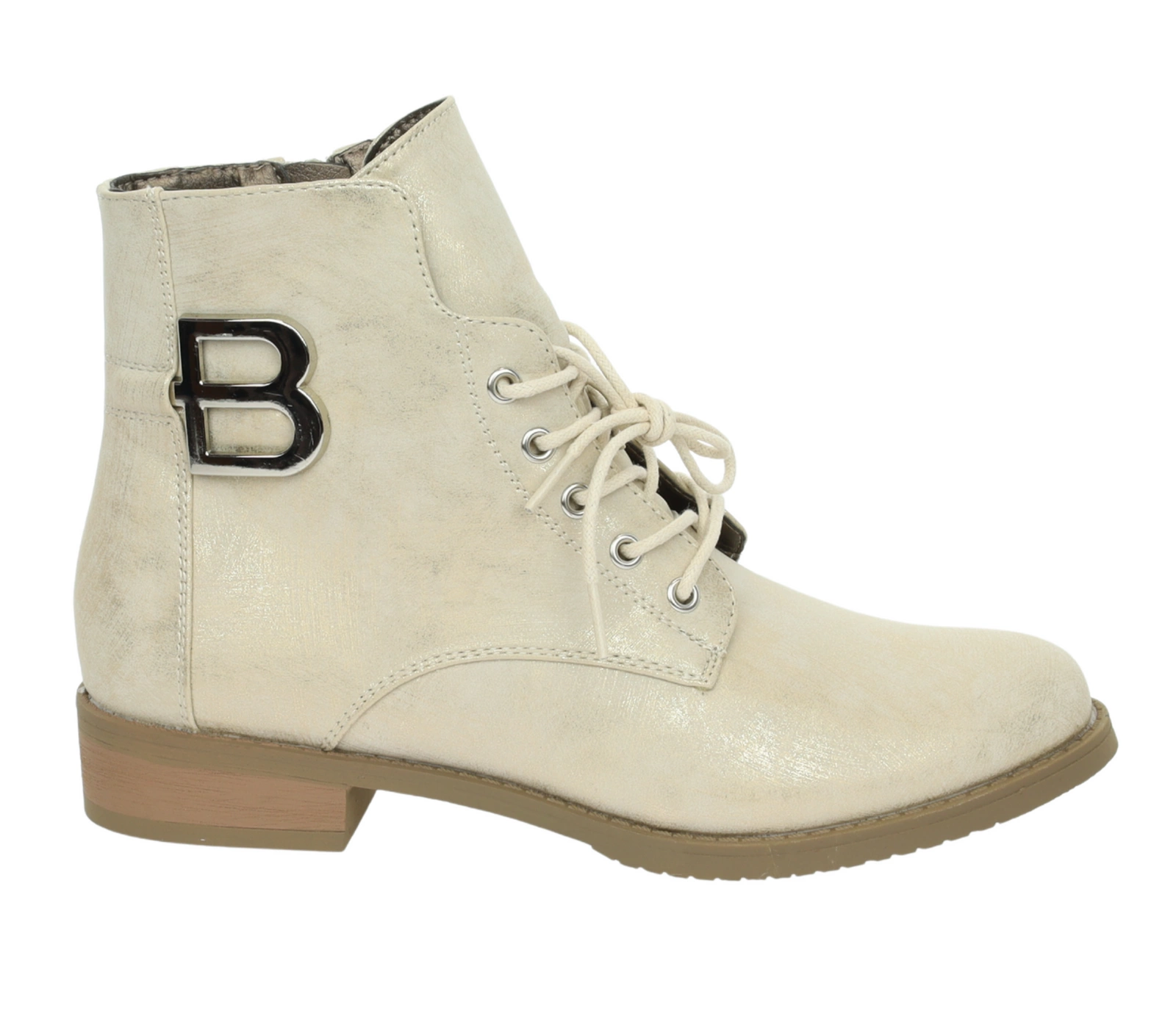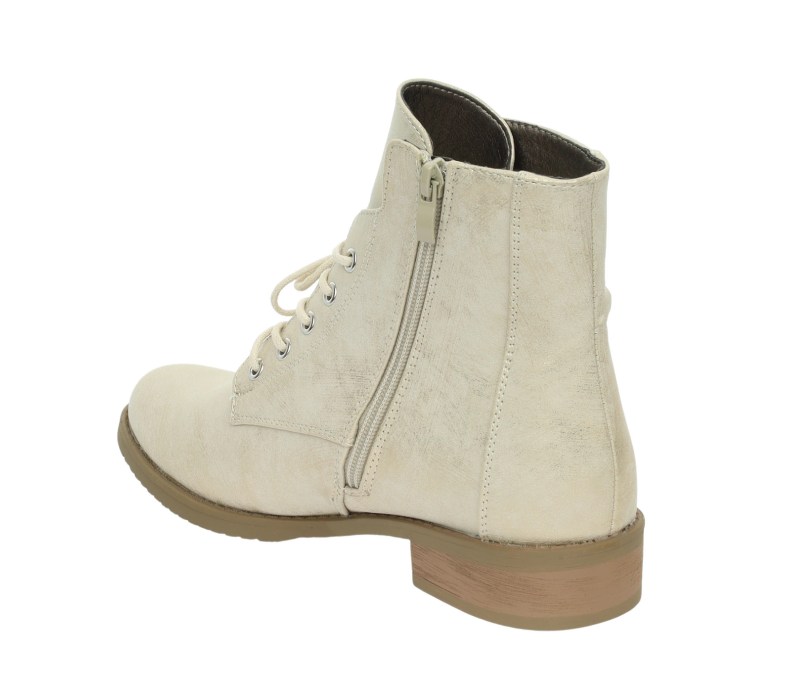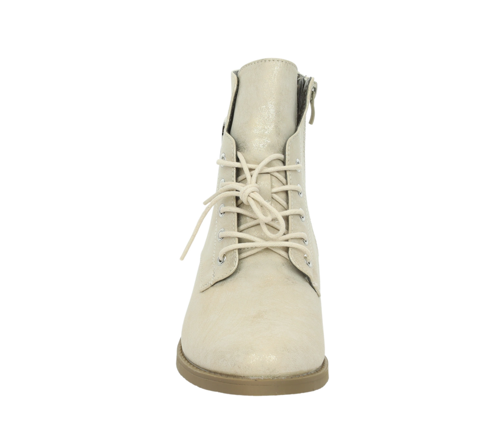 Beżowo-złote botki damskie jesienne ocieplane na płaskiej podeszwie Jezzi Złote botki marki Jezzi łączą klasyczny charakter z funkcjonalnością na co dzień. Stworzone z myślą o przyjemność noszenia, posiadają stabilną podeszwę.