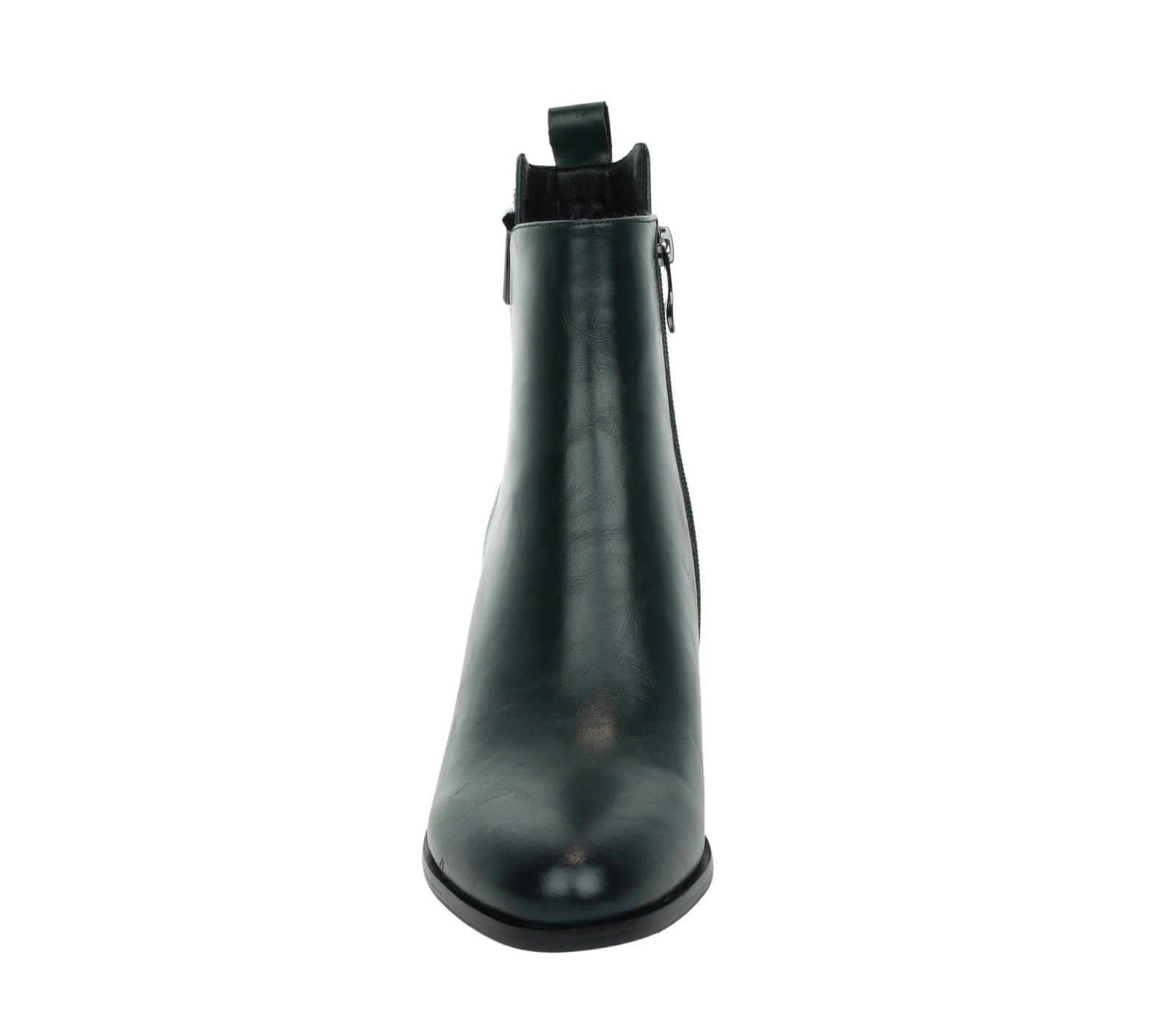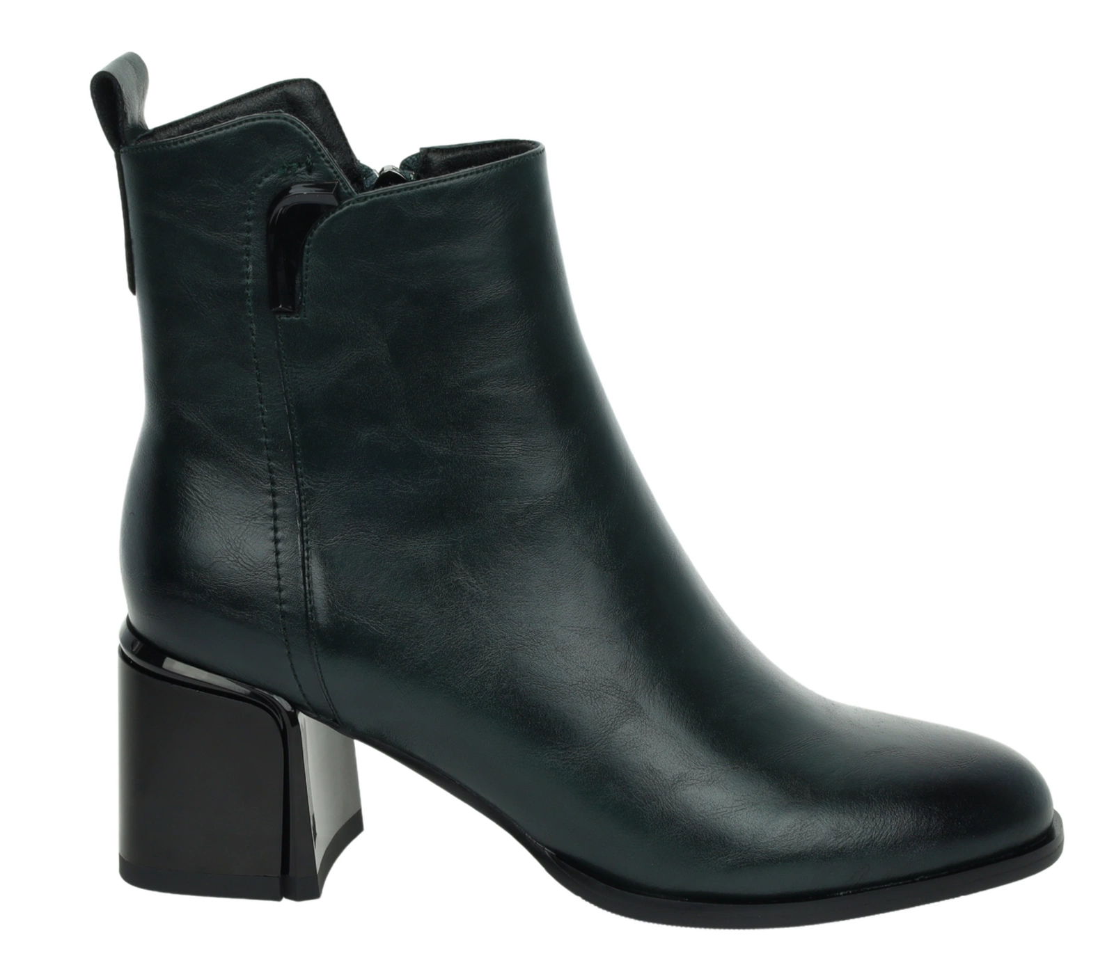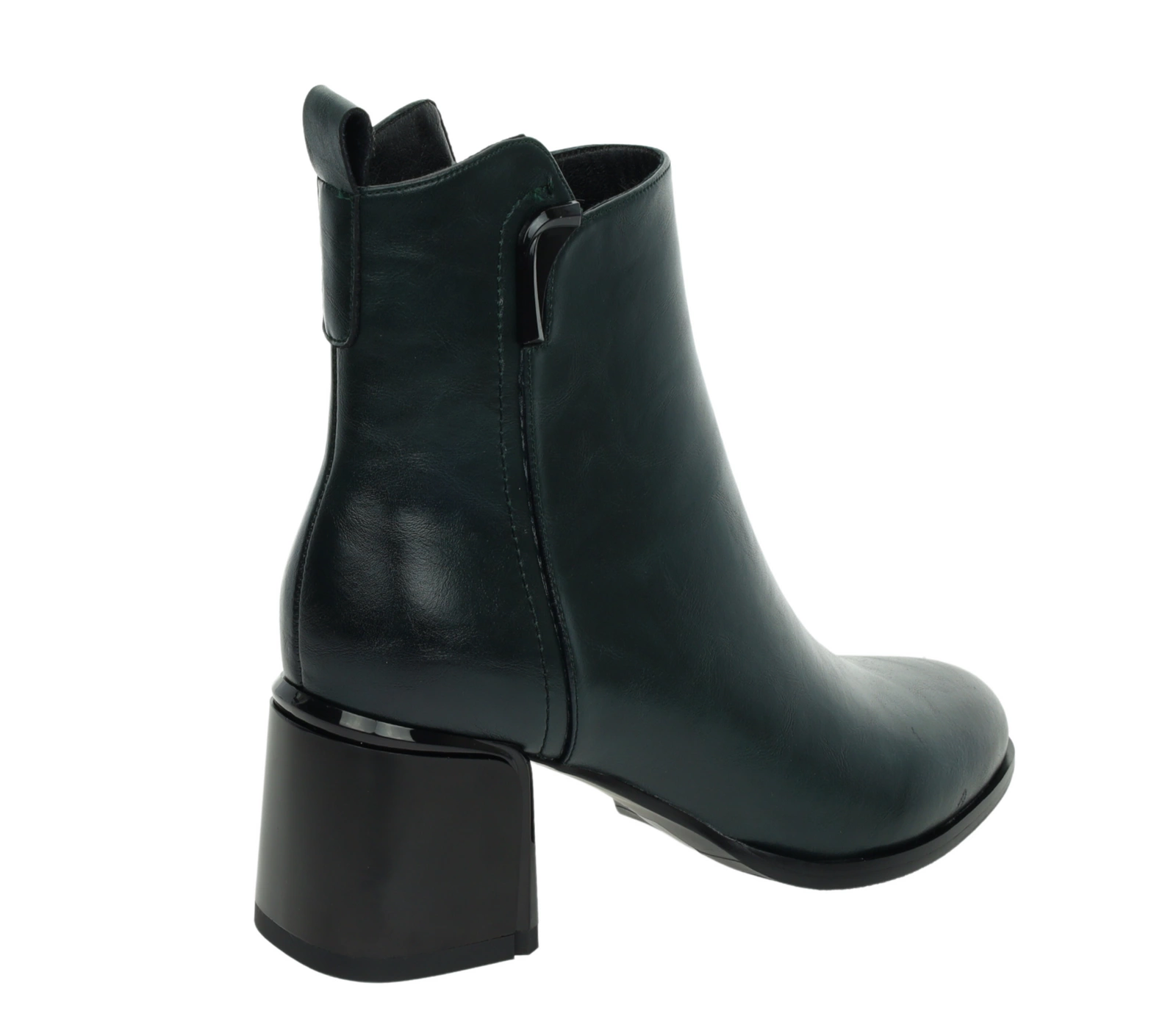 Eleganckie botki skórzane na średnim, stabilnym obcasie w kolorze ciemnozielonym. Botki damskie ze skóry naturalnej eleganckie i komfortowe na co dzień.