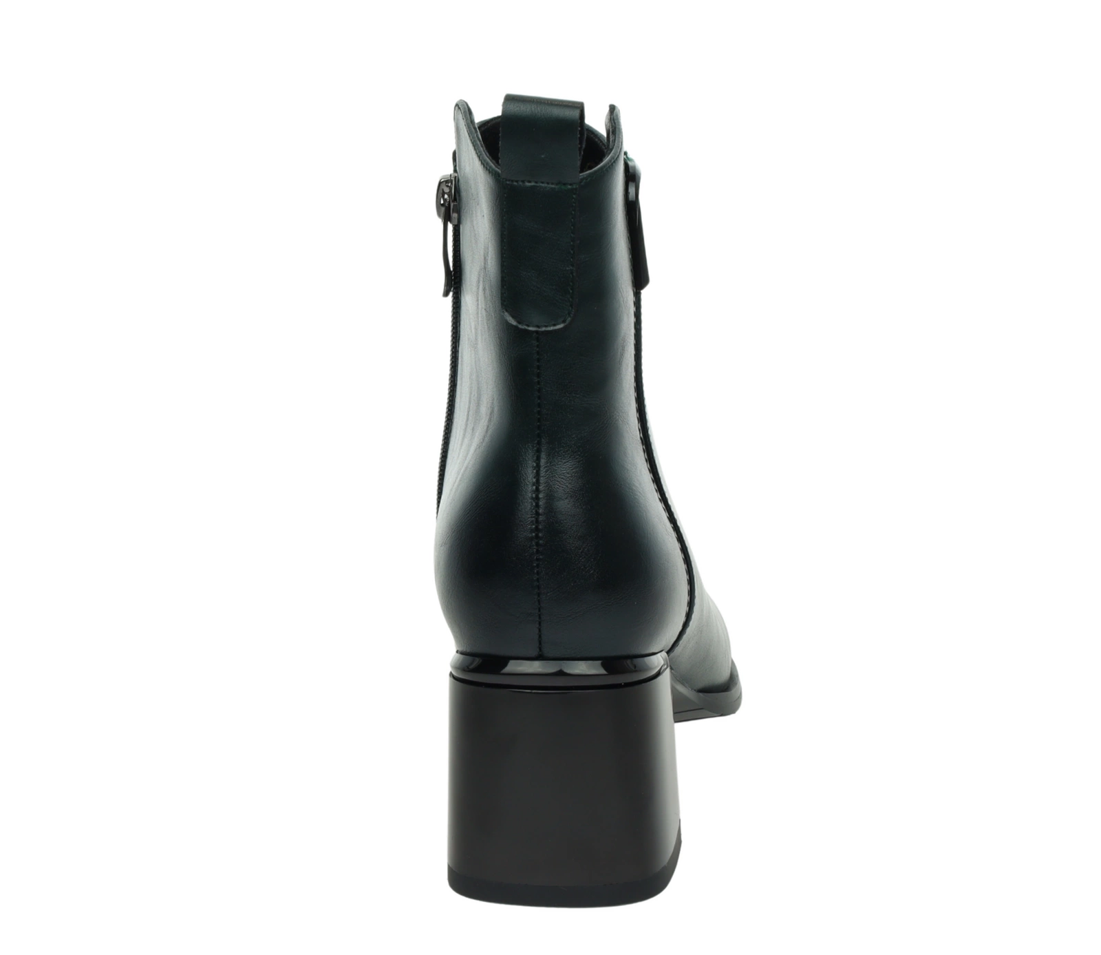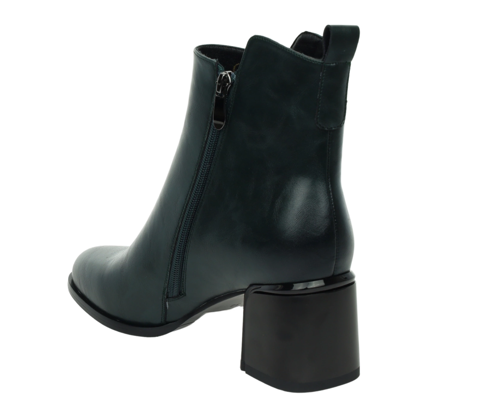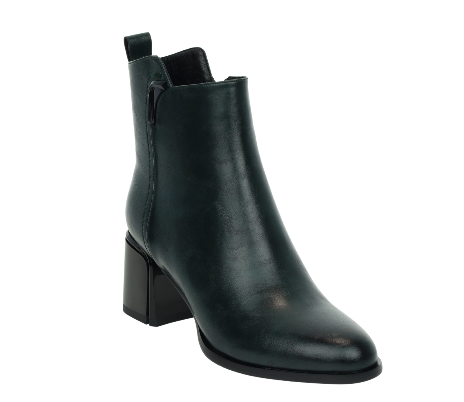 Eleganckie botki skórzane na średnim, stabilnym obcasie w kolorze ciemnozielonym. Botki damskie ze skóry naturalnej eleganckie i komfortowe na co dzień.