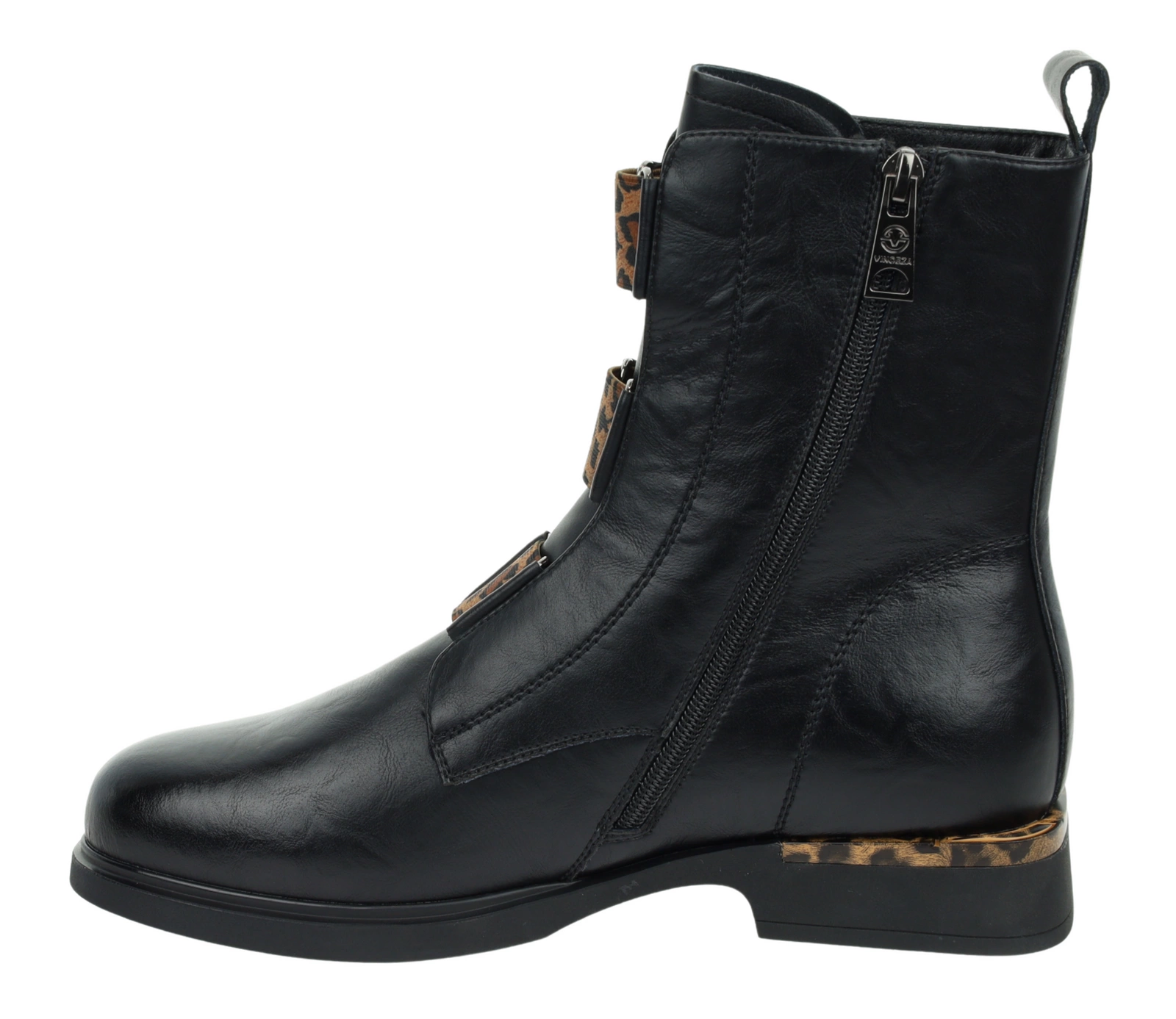 Czarne botki damskie VINCEZA — płaska podeszwa, wykonane ze skóry naturalnej, z modnymi elementami panterki. Miękkie wnętrze zapewnia komfort nawet przy dłuższym noszeniu, idealne na co dzień. Design łączy ponadczasową czernią z odrobiną drapieżnego akcentu, co czyni je uniwersalnym dodatkiem do wielu stylizacji — zarówno do jeansów, legginsów, jak i sukienek. Dostępne rozmiary 36-41.