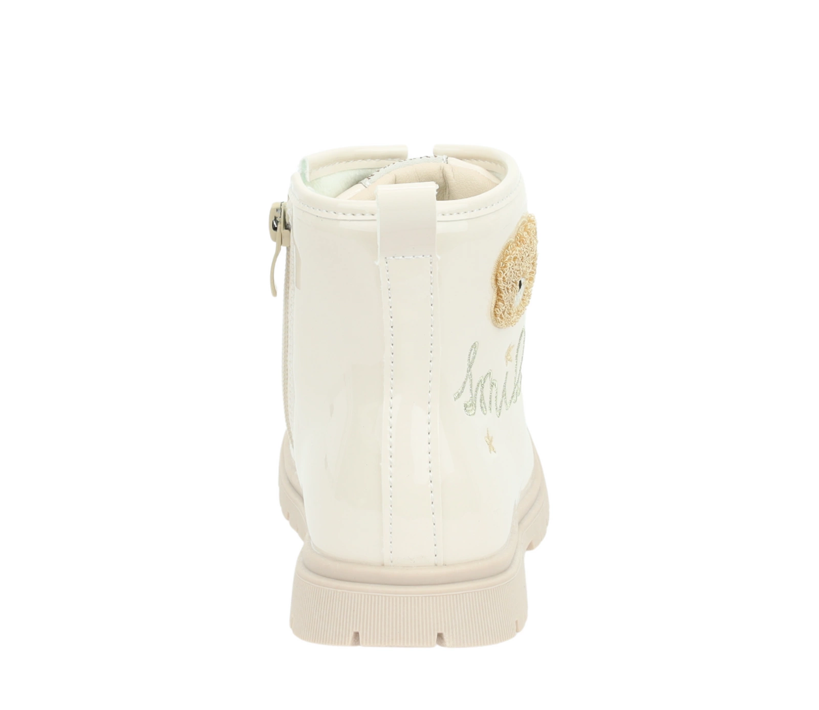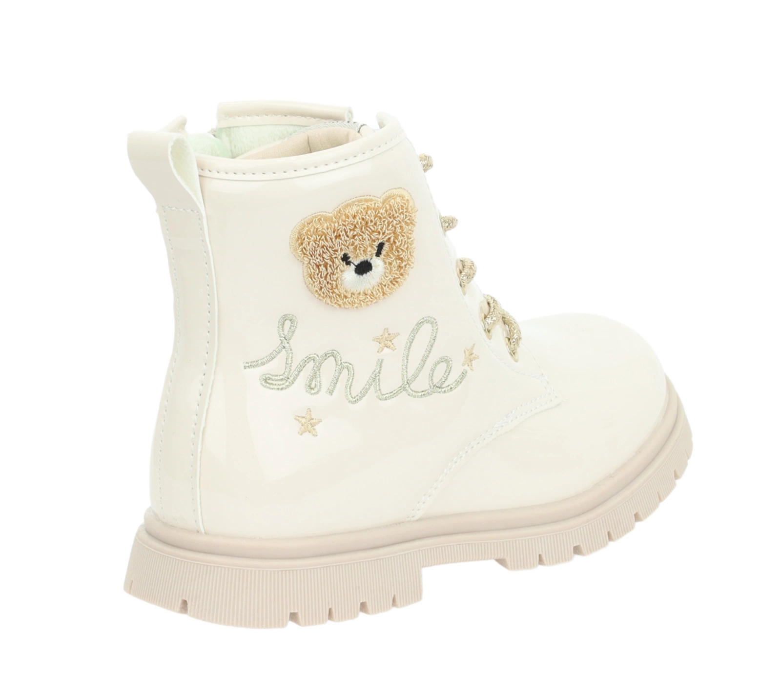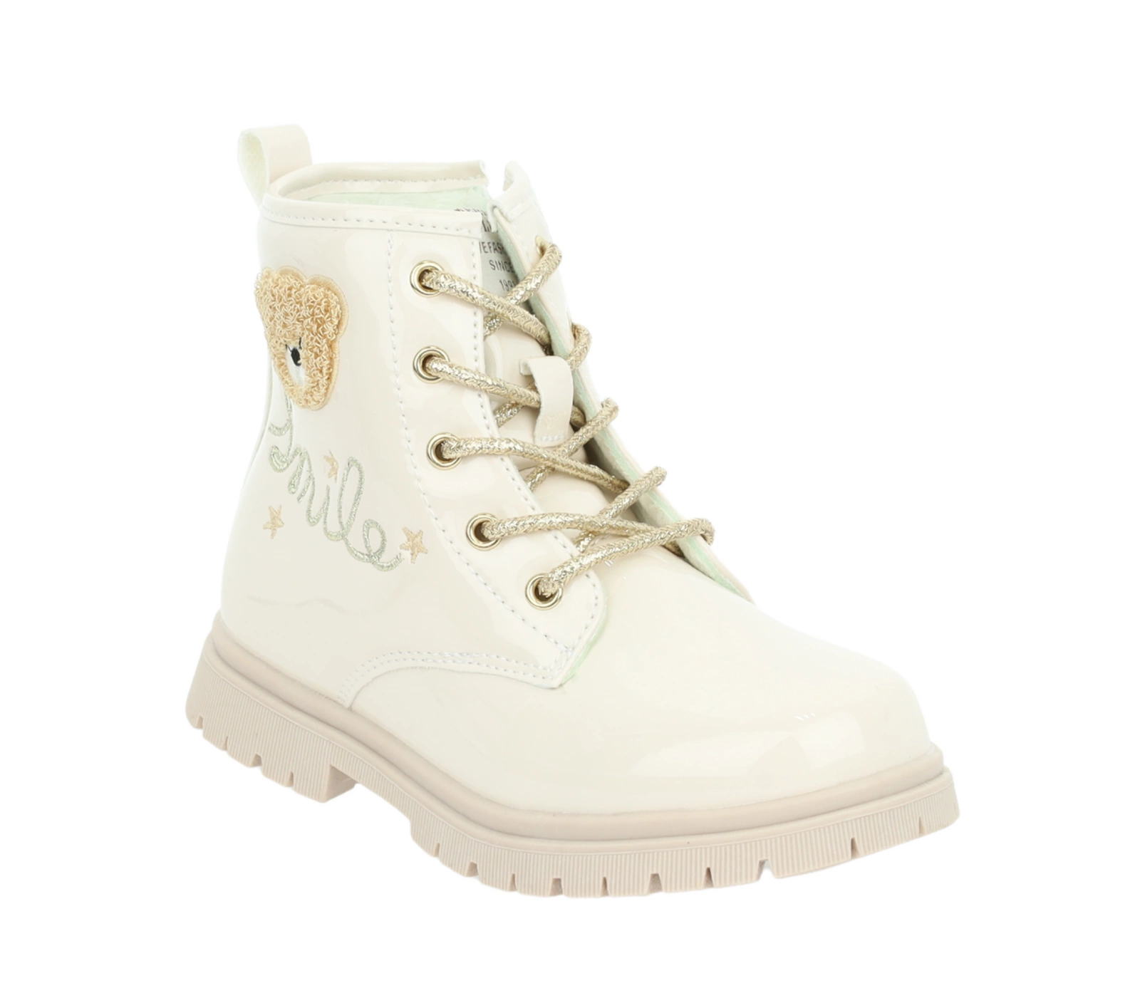 Beżowe lakierowane botki dziecięce jesienne ocieplane z Misiem