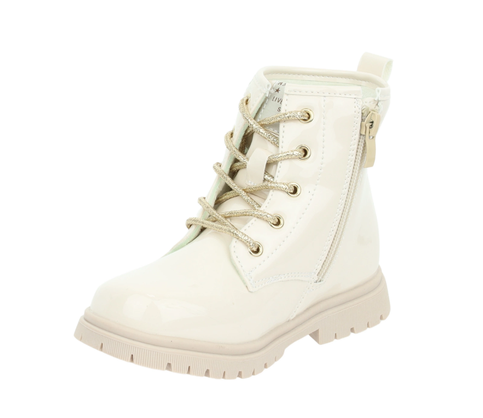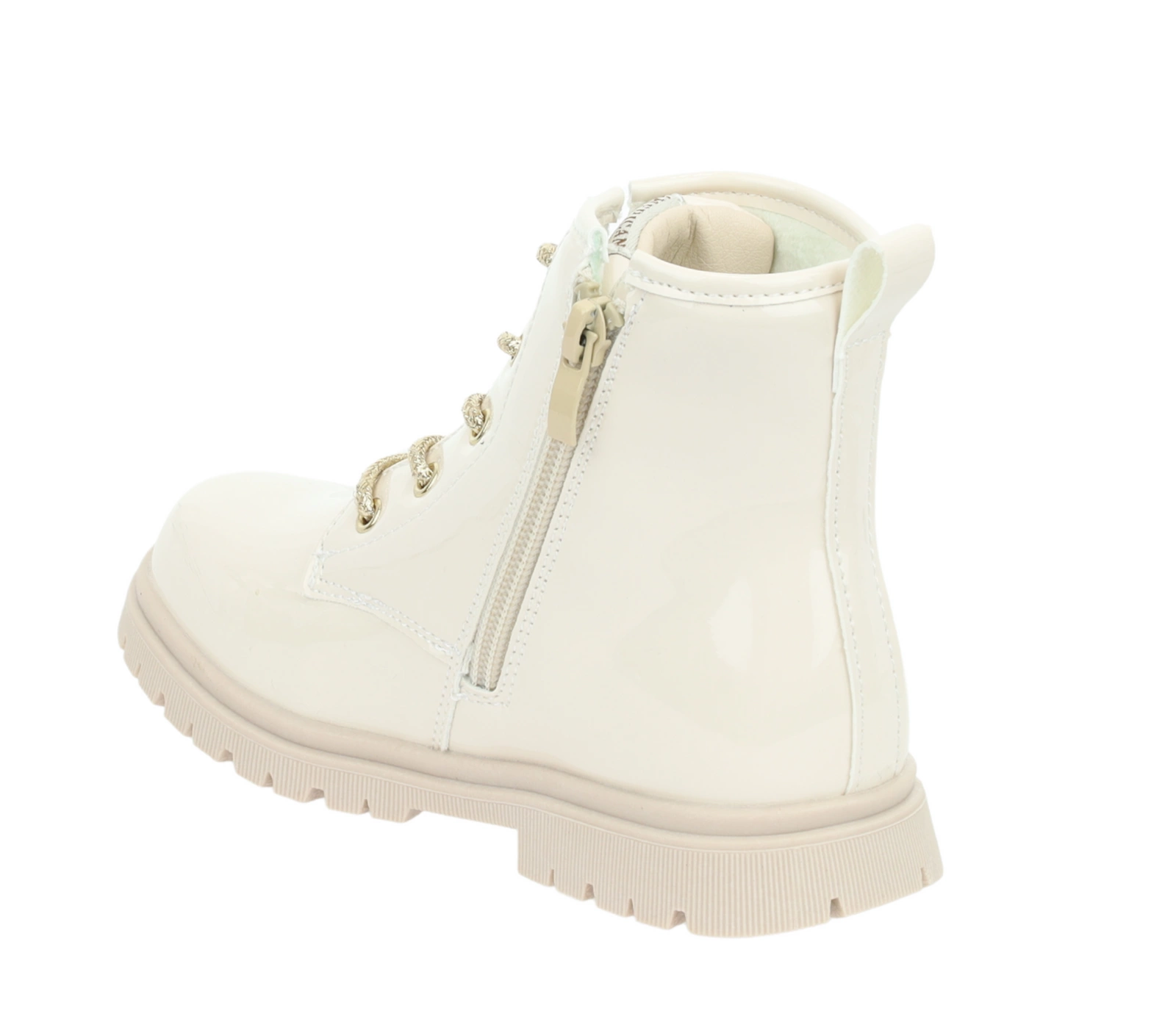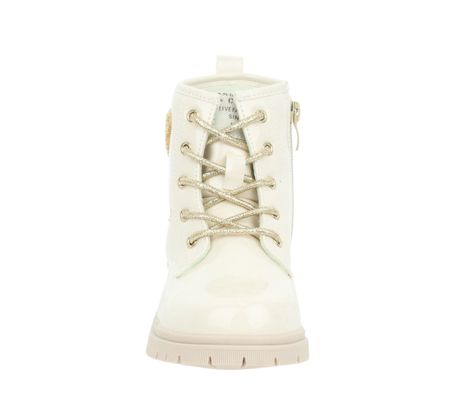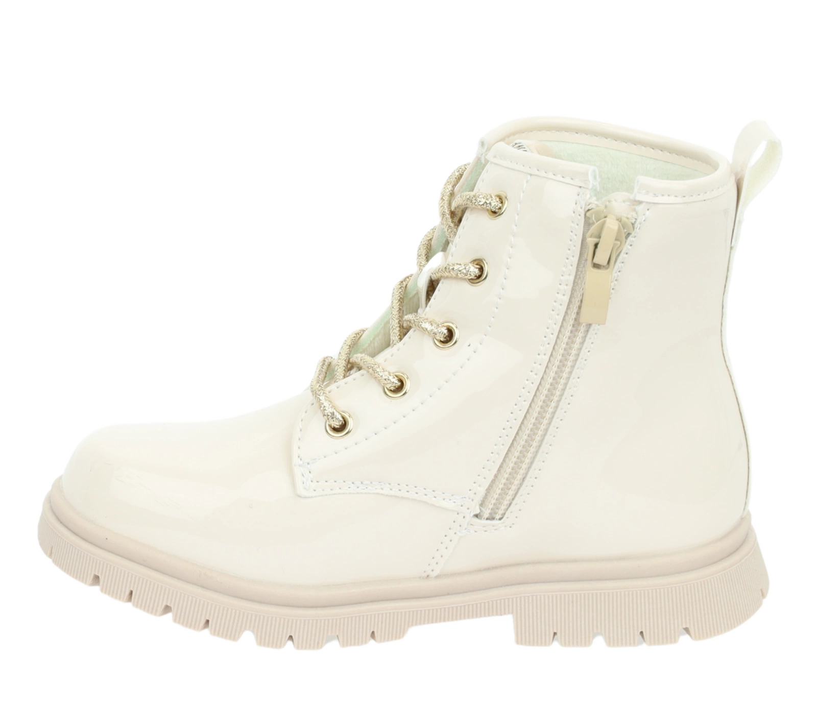 Beżowe lakierowane botki dziecięce jesienne ocieplane z Misiem