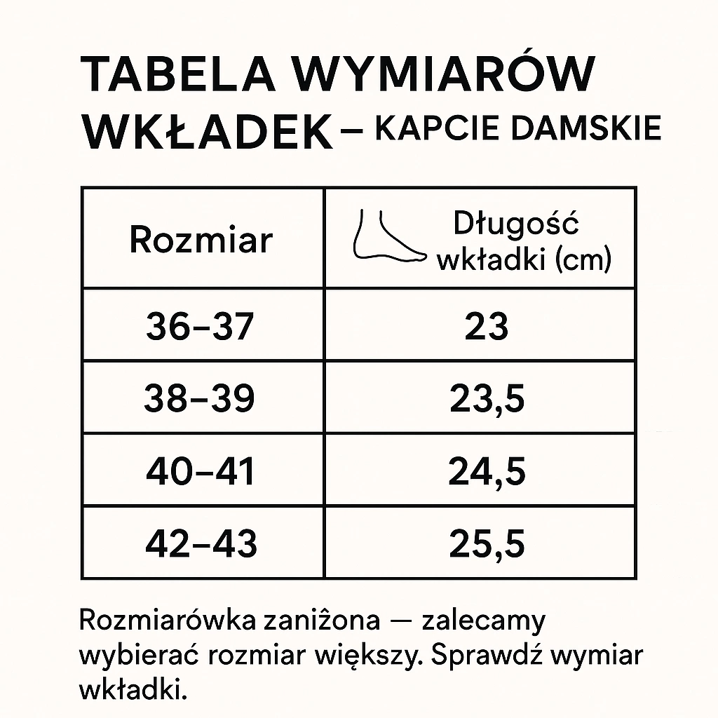 | Rozmiar | Rozmiarówka zaniżona - Długość wkładki (cm) |