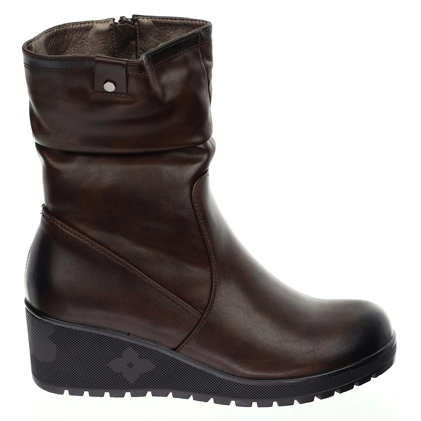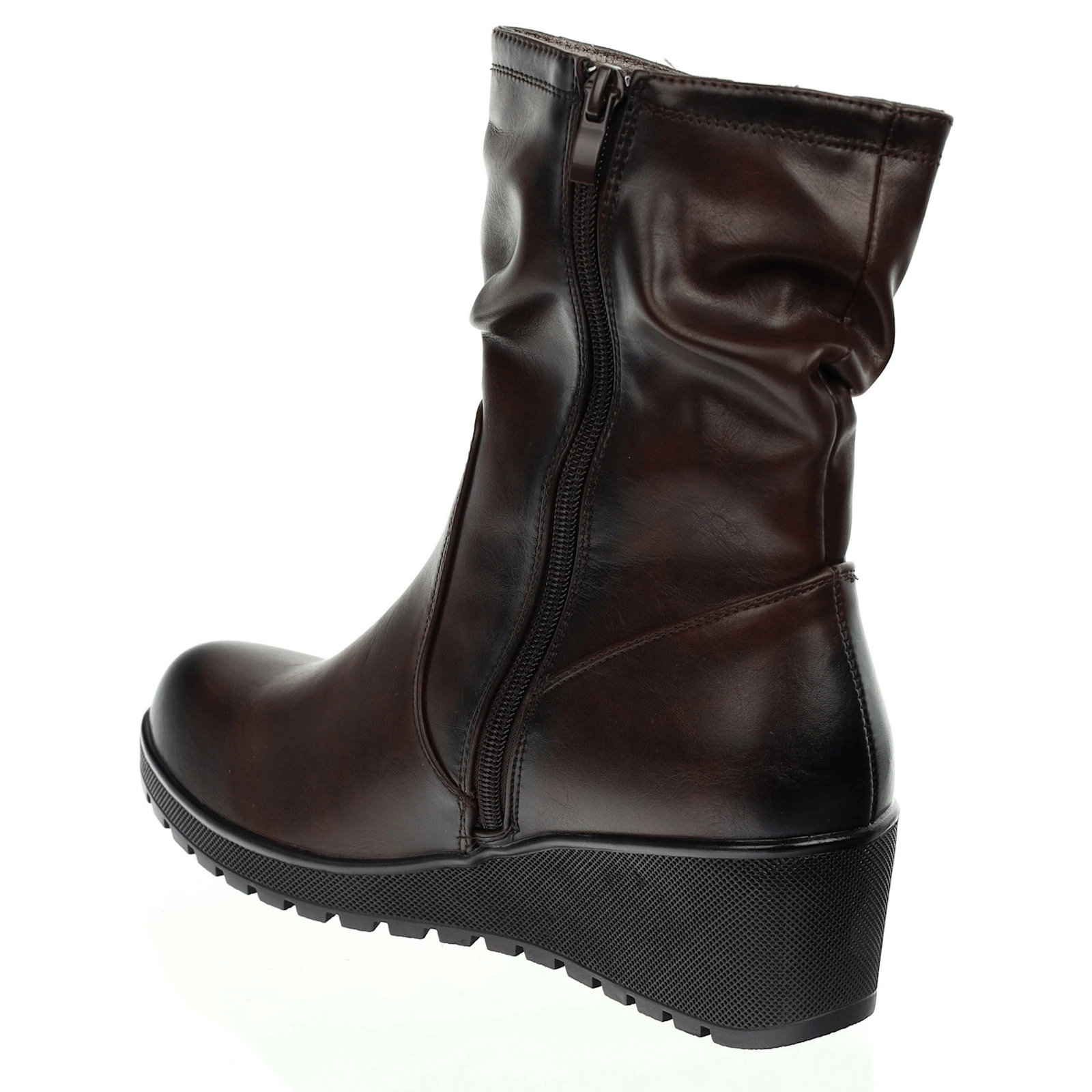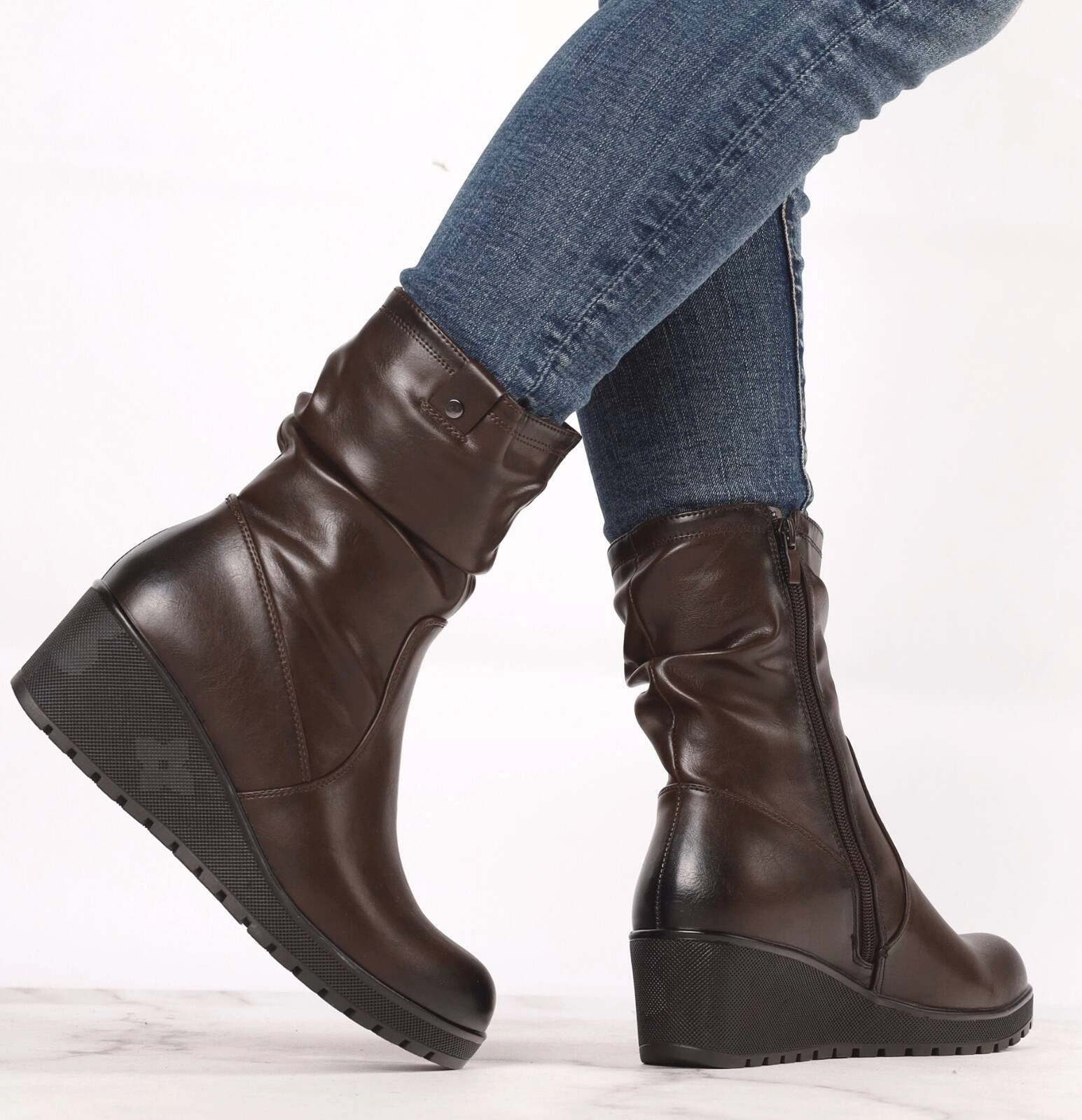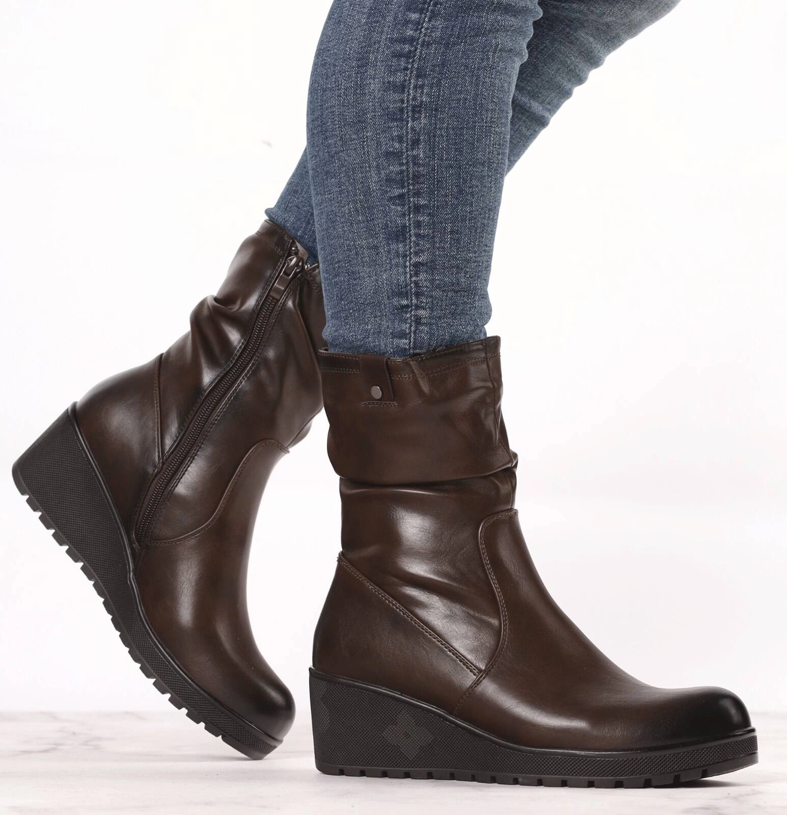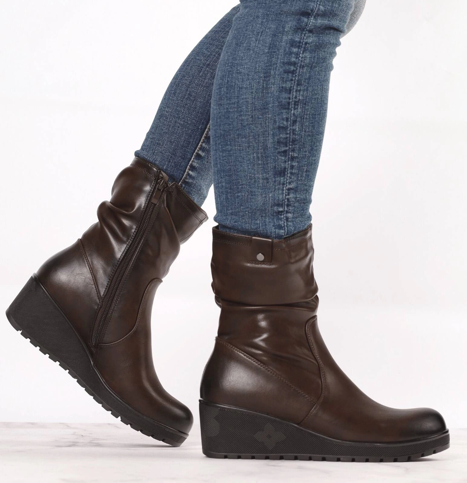 Brązowe czekoladowe botki zimowe komfortowe na koturnie Jezzi