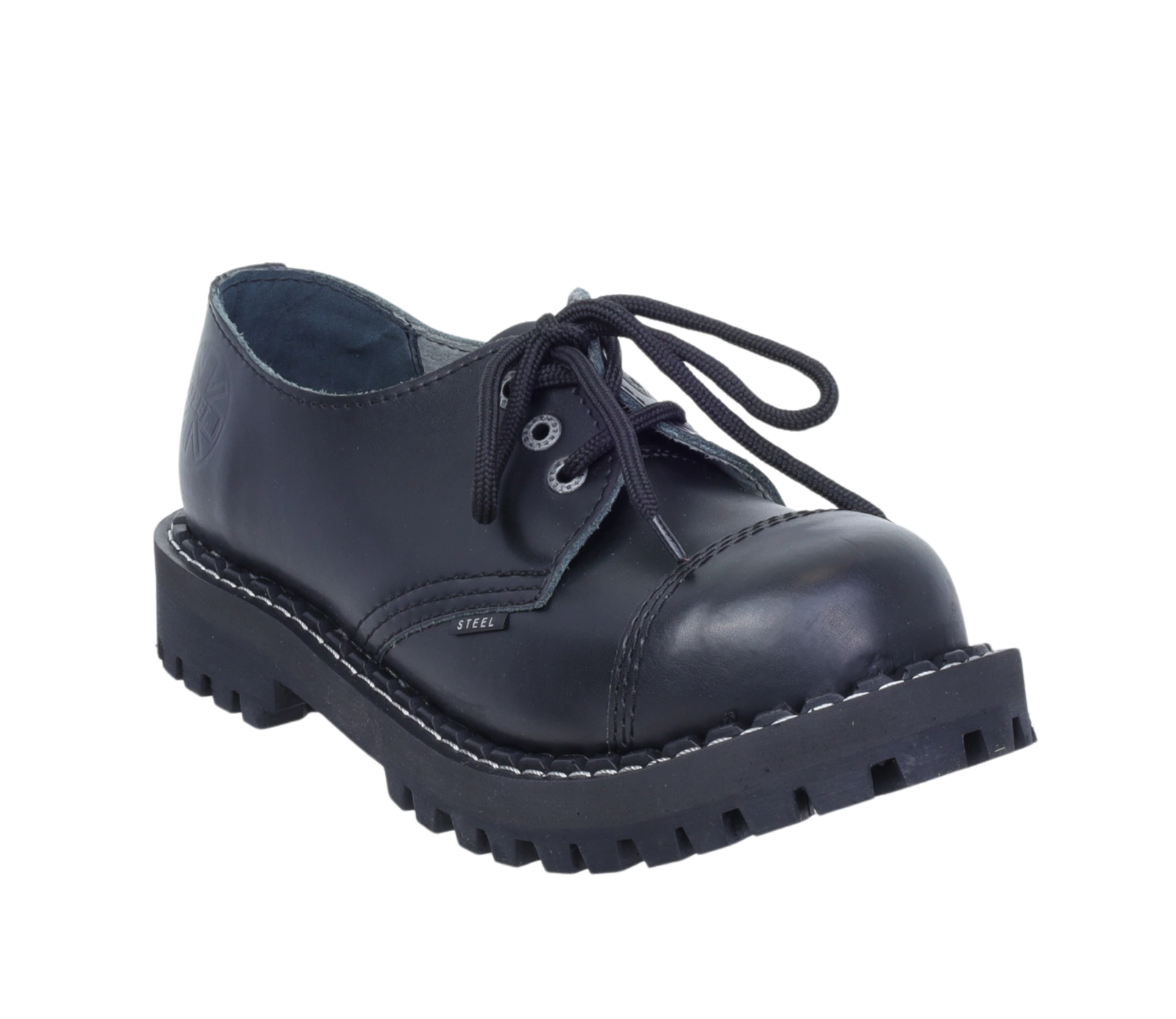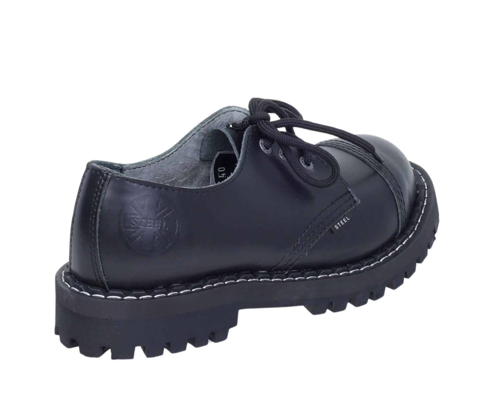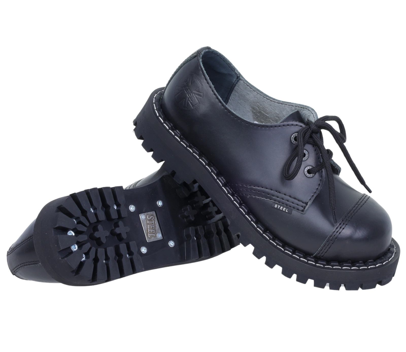 Krótkie glany/półbuty marki Steel wzór 102/101 dla mężczyzn oraz kobiet. Wykonane ze skóry naturalnej, na grubej podeszwie ze śrubami. Wiązane na 3 oczka. Nosek twardy z metalowym obiciem obszytym skórą. Podeszwa z wysokogatunkowego tworzywa sztucznego, wzmocniona śrubami w rockowym stylu. Glany 101/102 marki Steel do kostki to świetna alternatywa dla wysokich glanów.