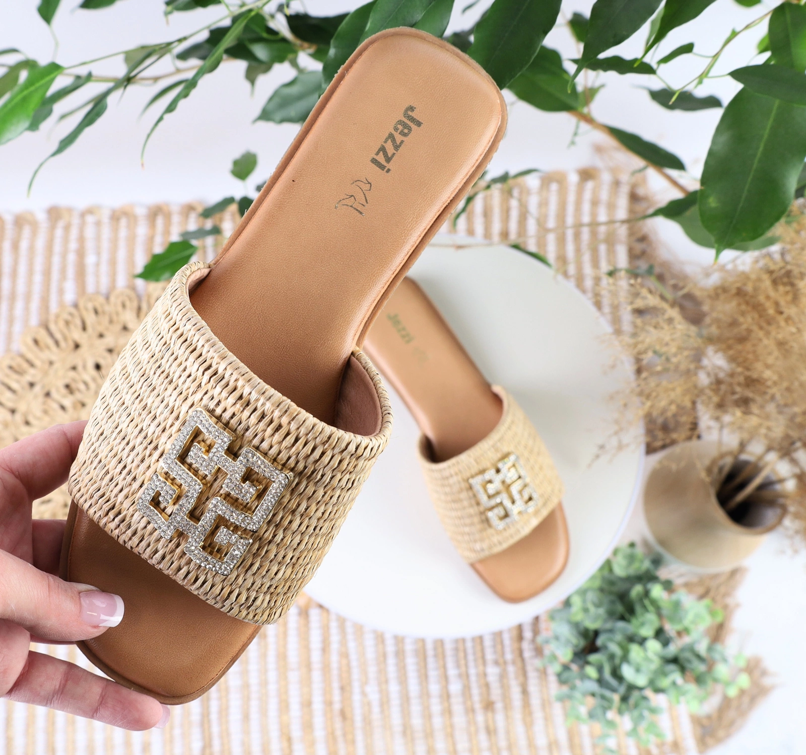 Eleganckie brązowe klapki płaskie ze złotą klamrą i diamencikami. Plecione czarne klapki płaskie od Jezzi.