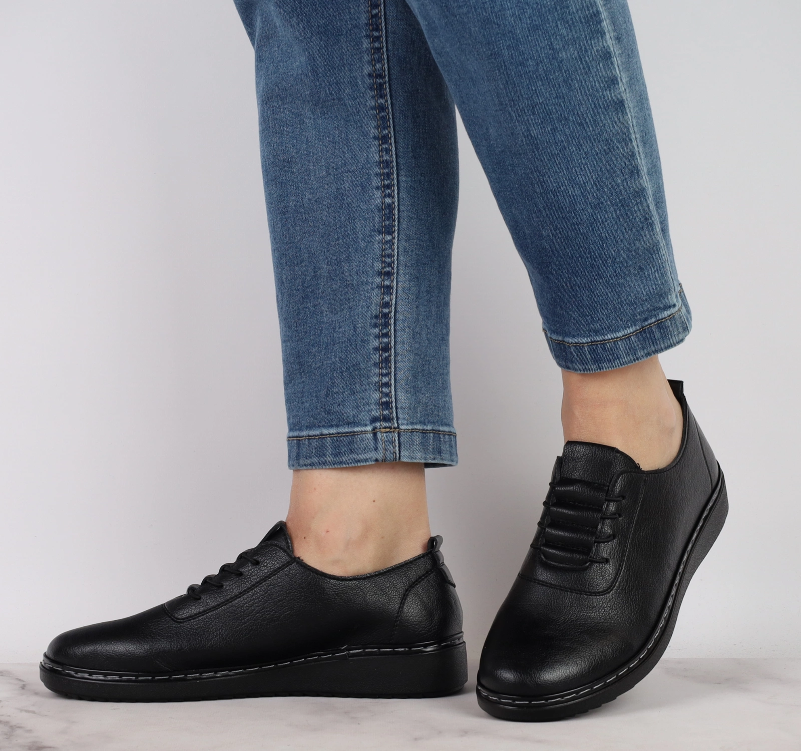 Wygodne półbuty damskie ze skóry ekologicznej zdrowotne, medyczne, profilowane. Półbuty damskie czarne bardzo wygodne, idealne do kościoła i zakupy na mieście.
