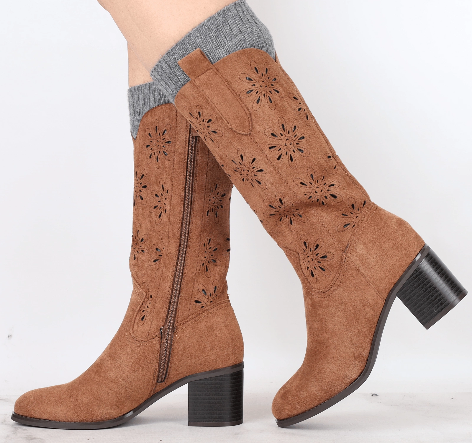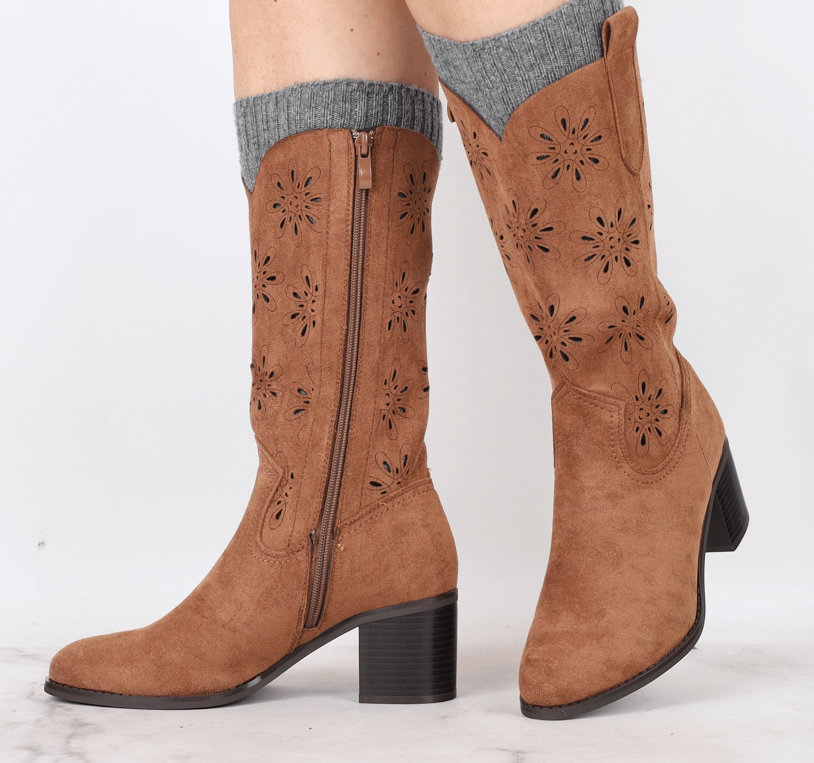 Brązowe kozaki kowbojki na niskim obcasie. Brązowe jesienne, nieocieplane kozaki z ażurową, wycinaną cholewką w kolorze butelkowej zieleni.