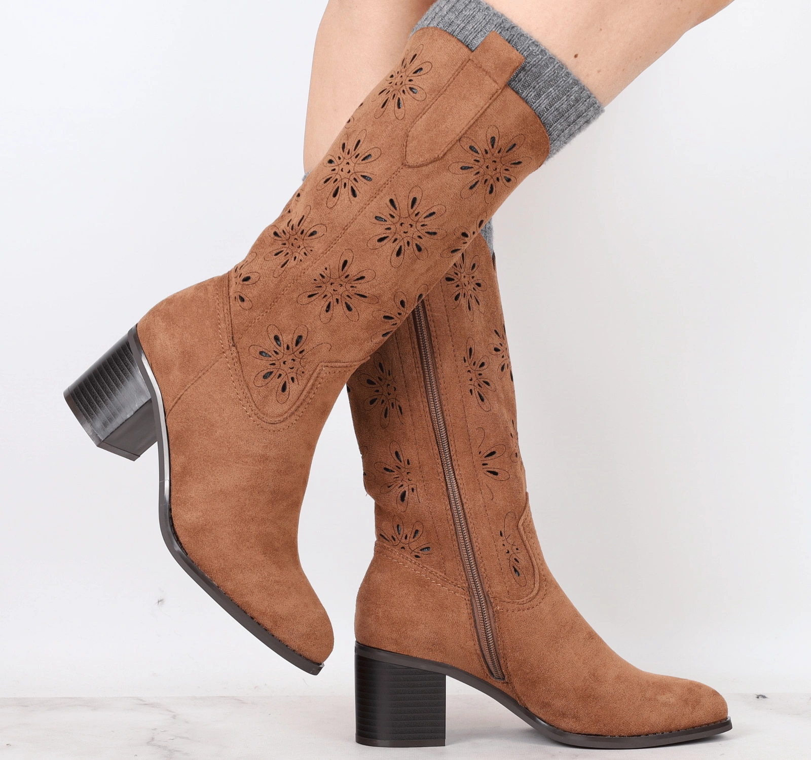 Zamszowe ażurowe kozaki brązowe czekoladowe na wygodnym obcasie Jezzi