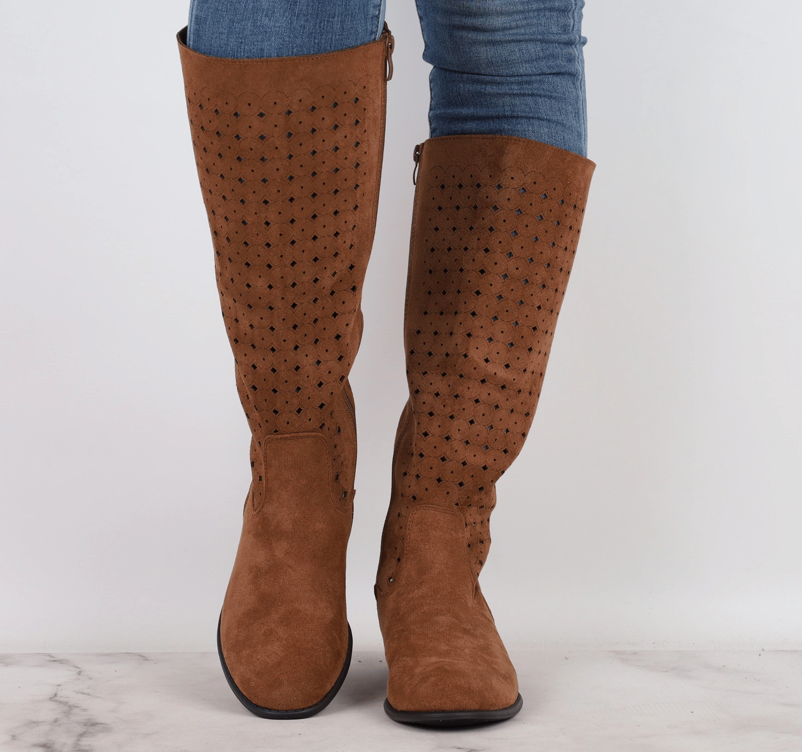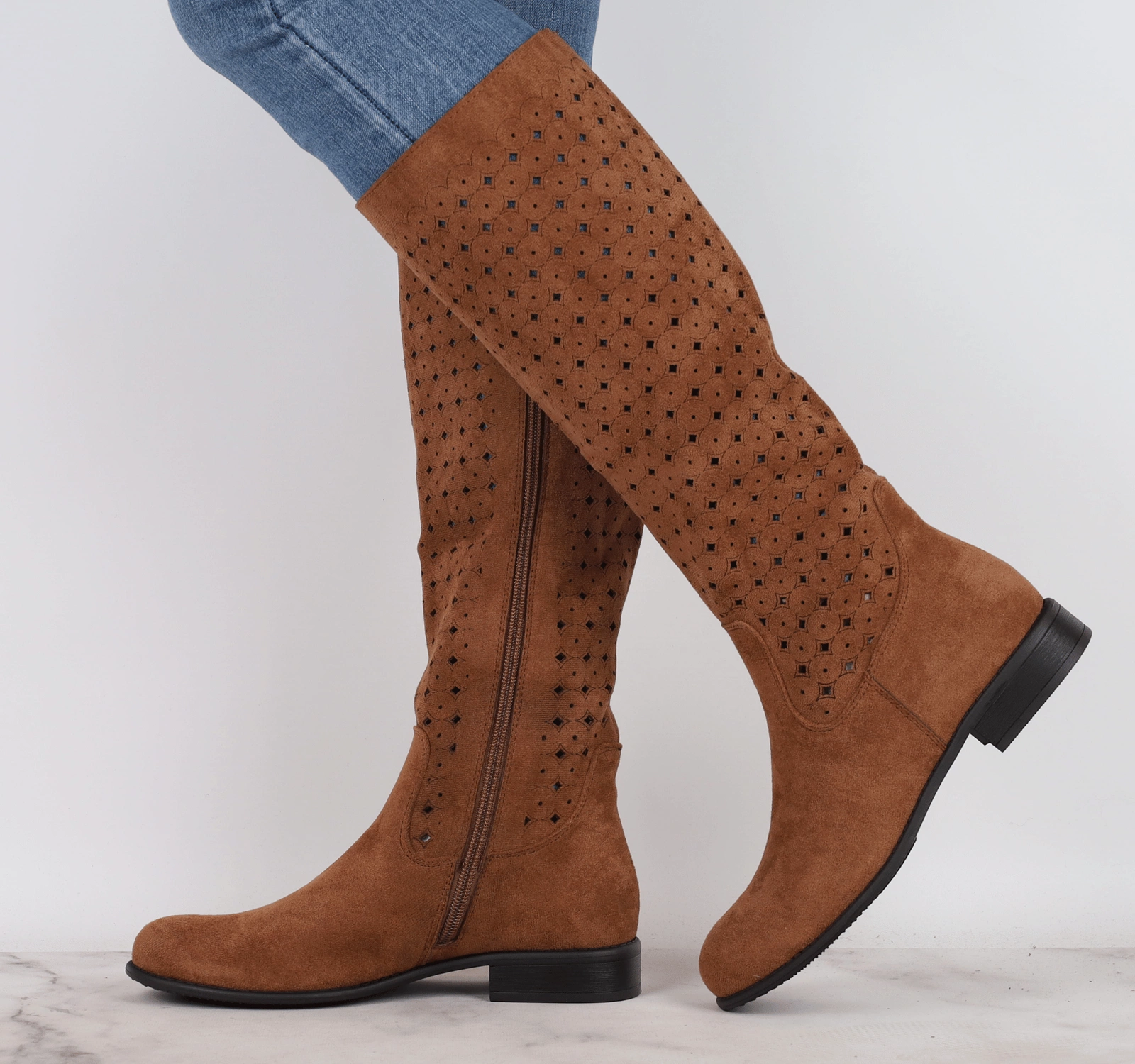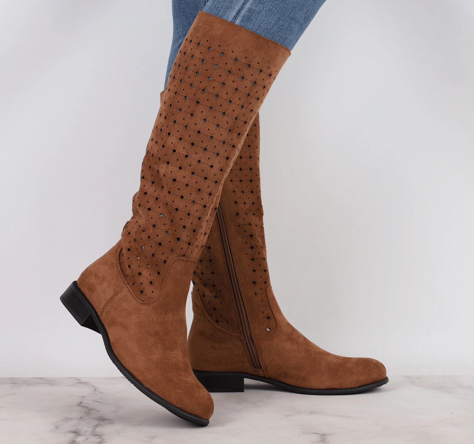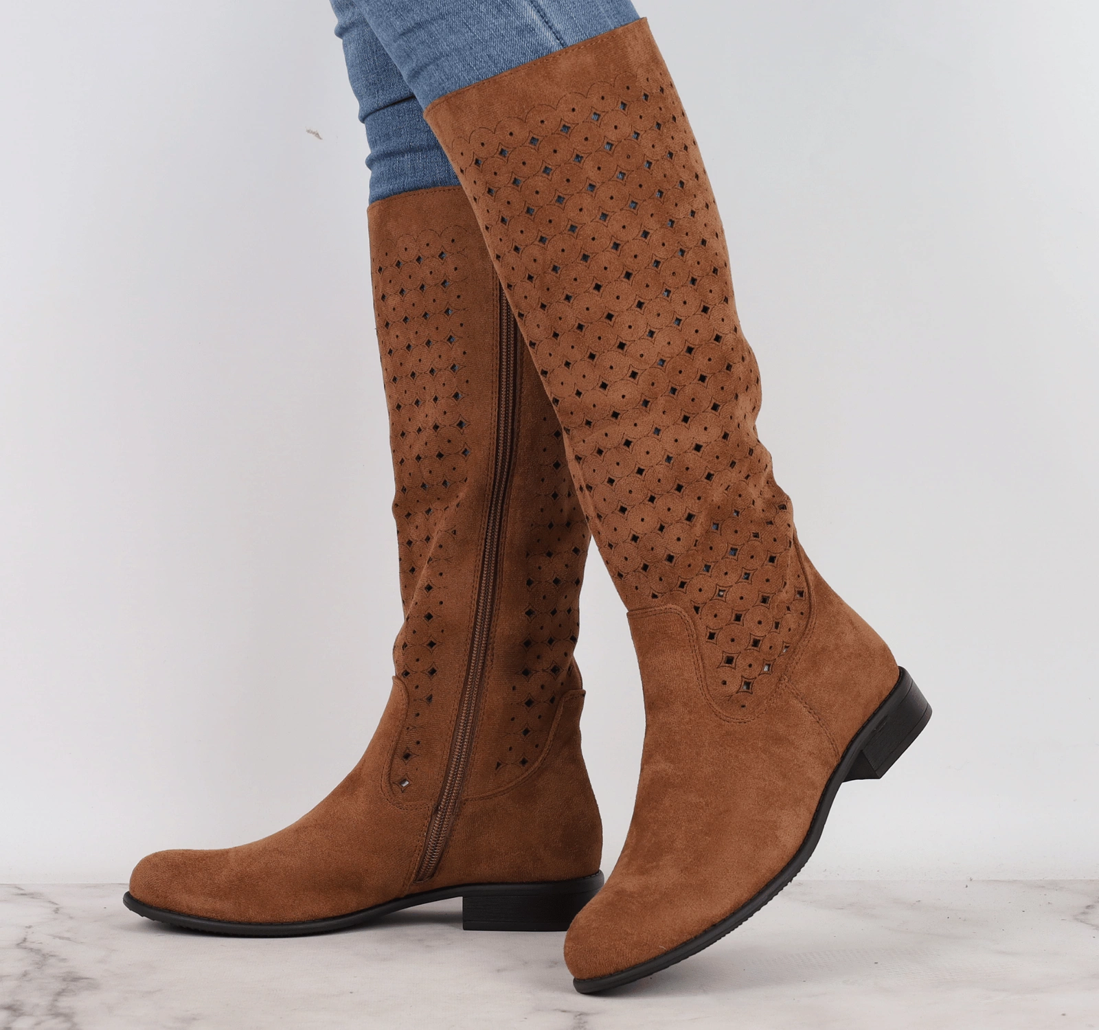 Jesienne brązowe kozaki nieocieplane na płaskim obcasie. Ażurowe zamszowe kozaki płaskie z ażurową, wycinaną cholewką.