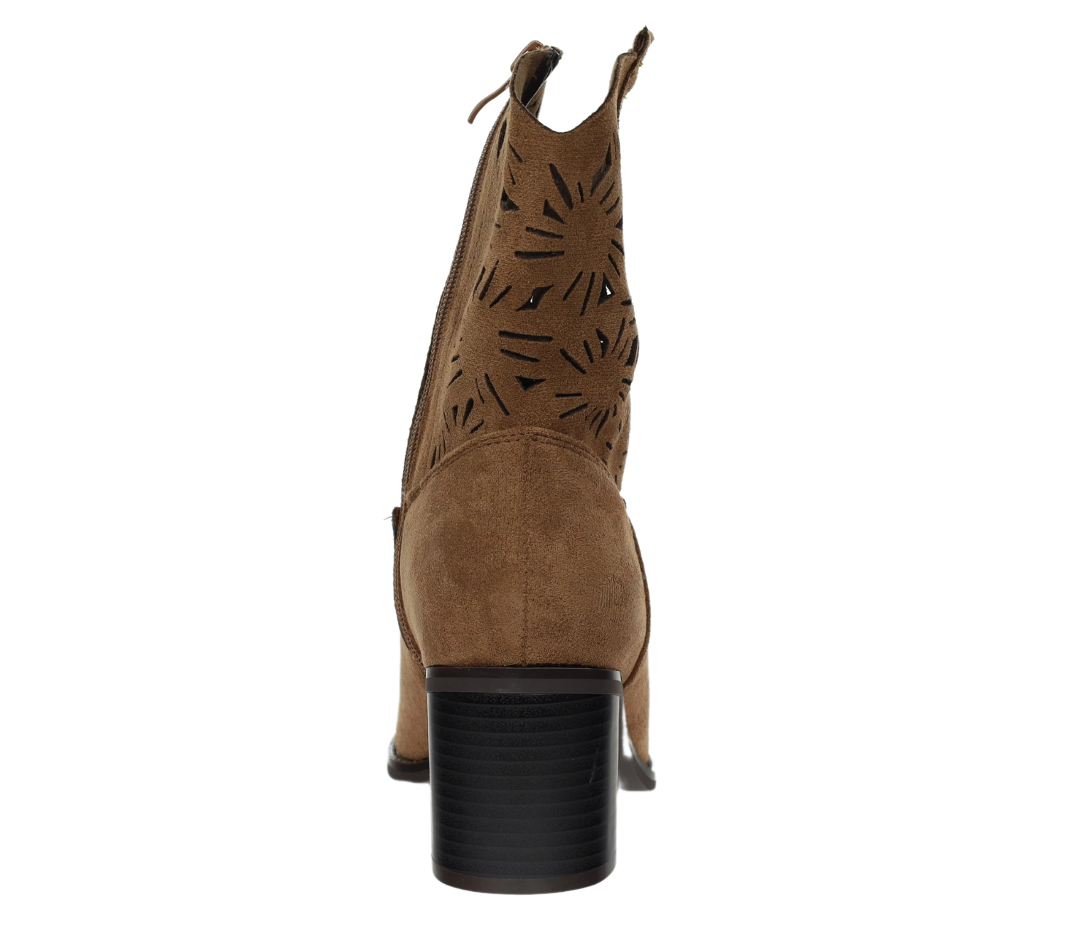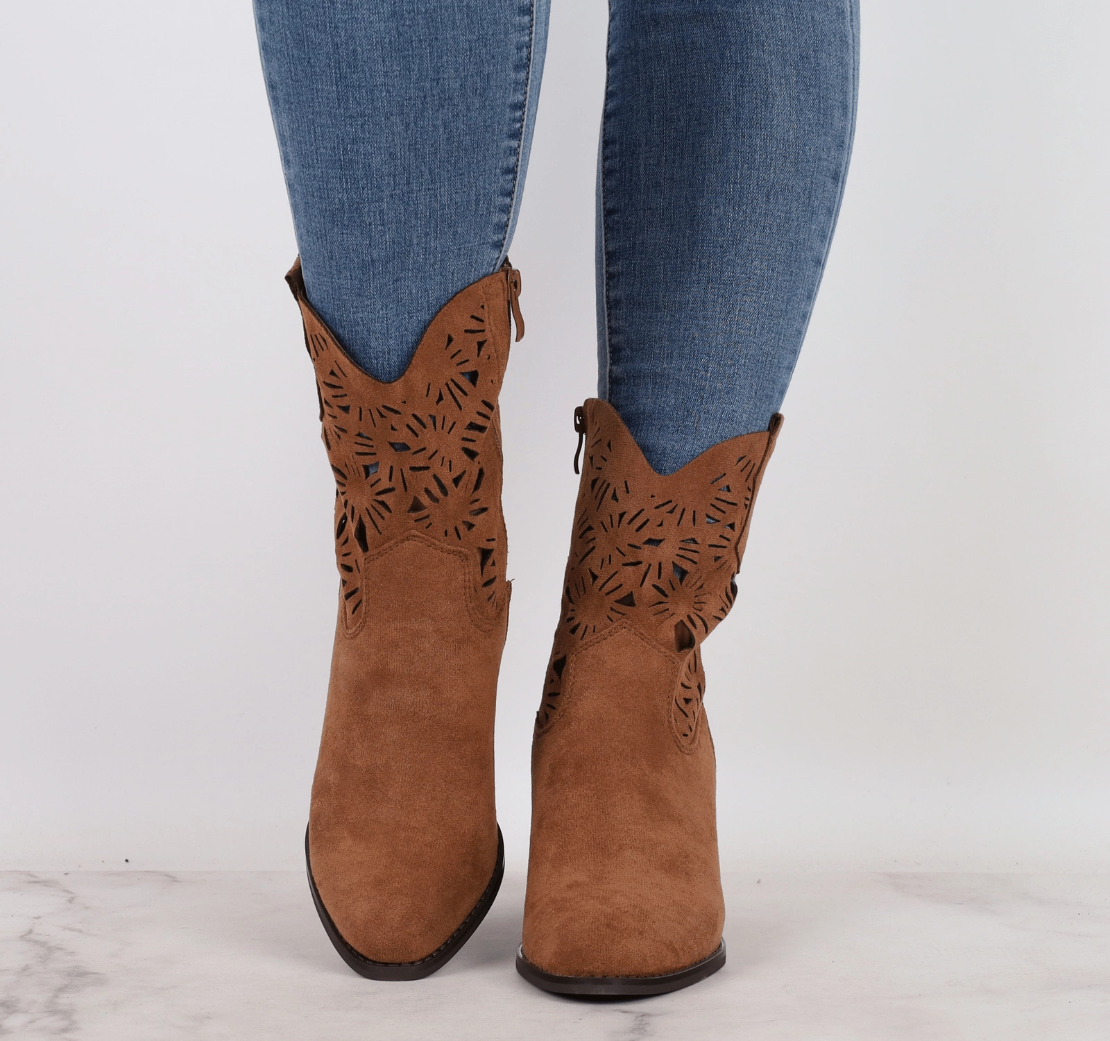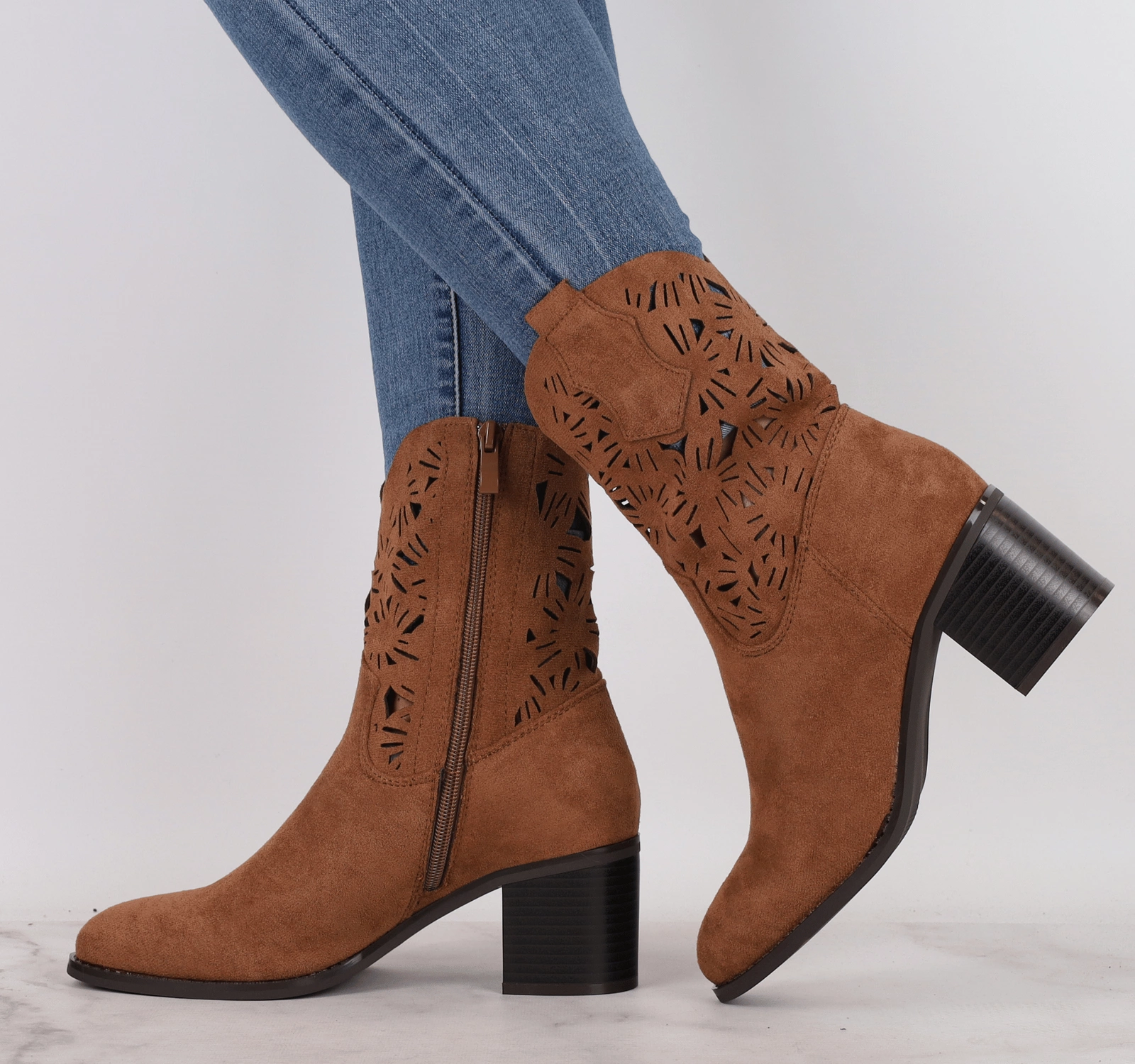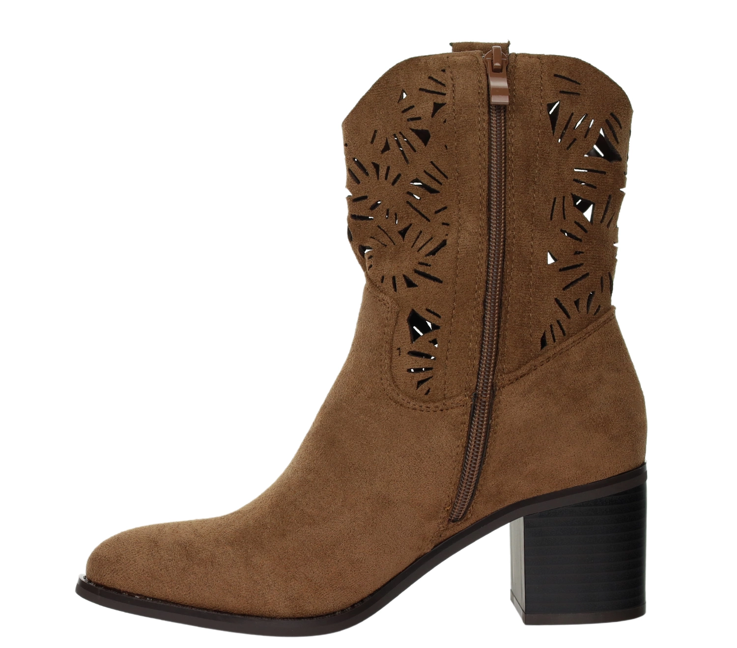 Brązowe czekoladowe zamszowe botki wycinane na obcasie ocieplane Daszyński