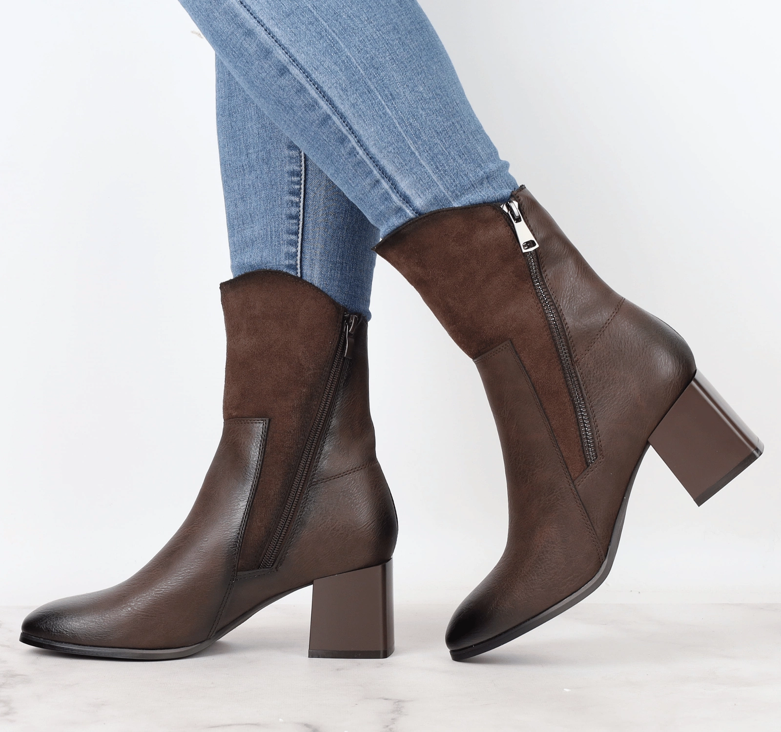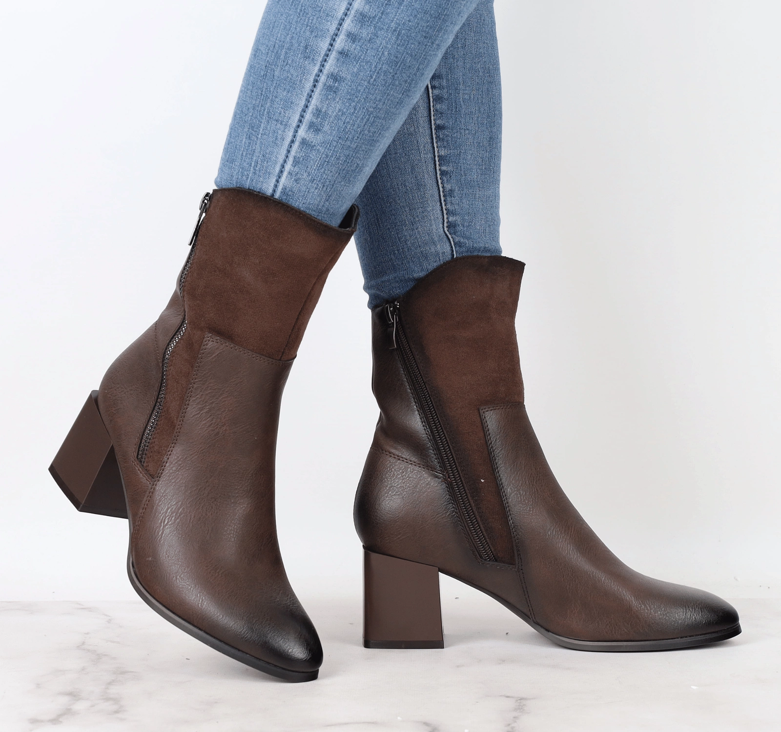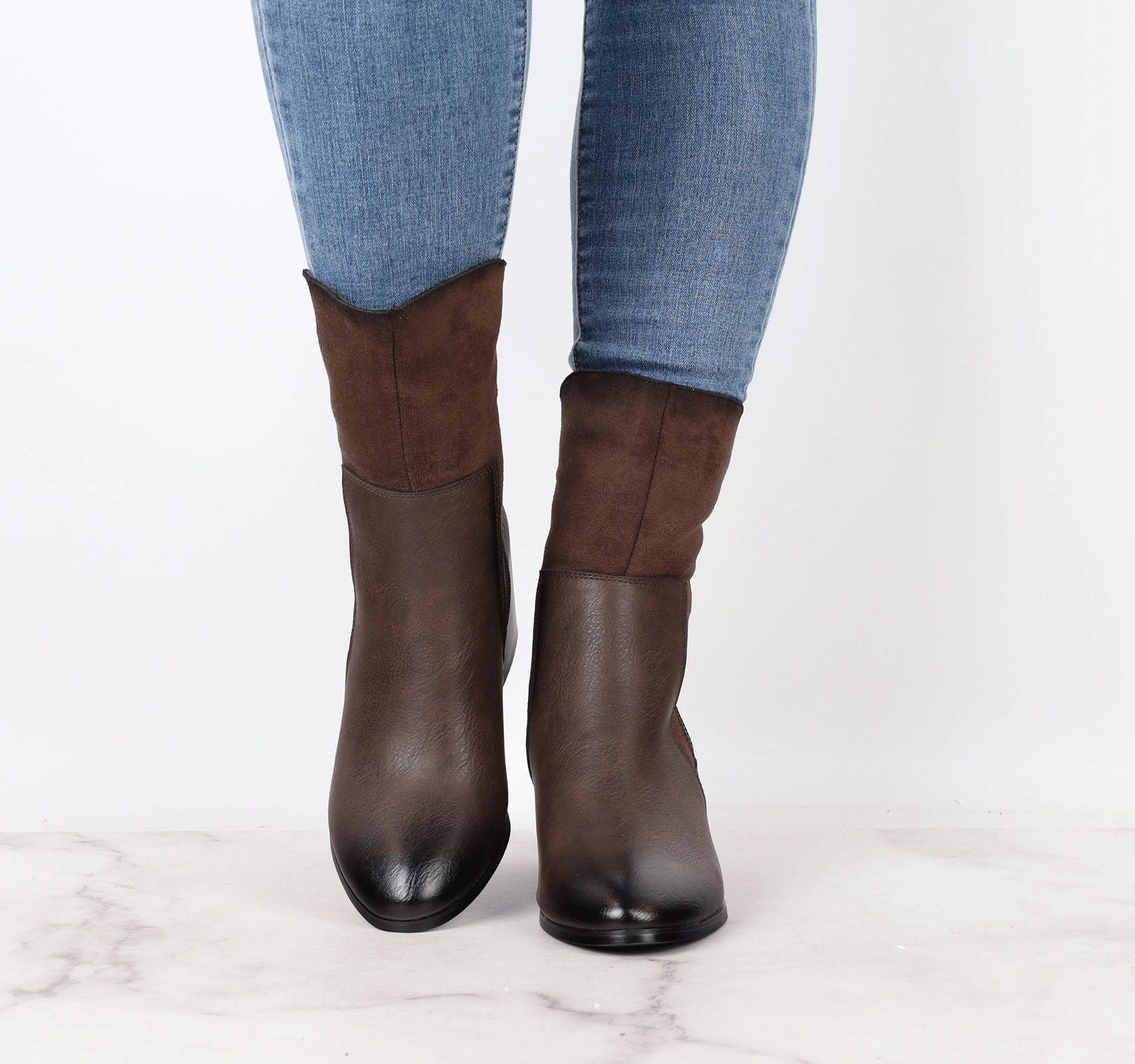 Stylowe brązowe botki damskie na obcasie z zamszowym wykończeniem