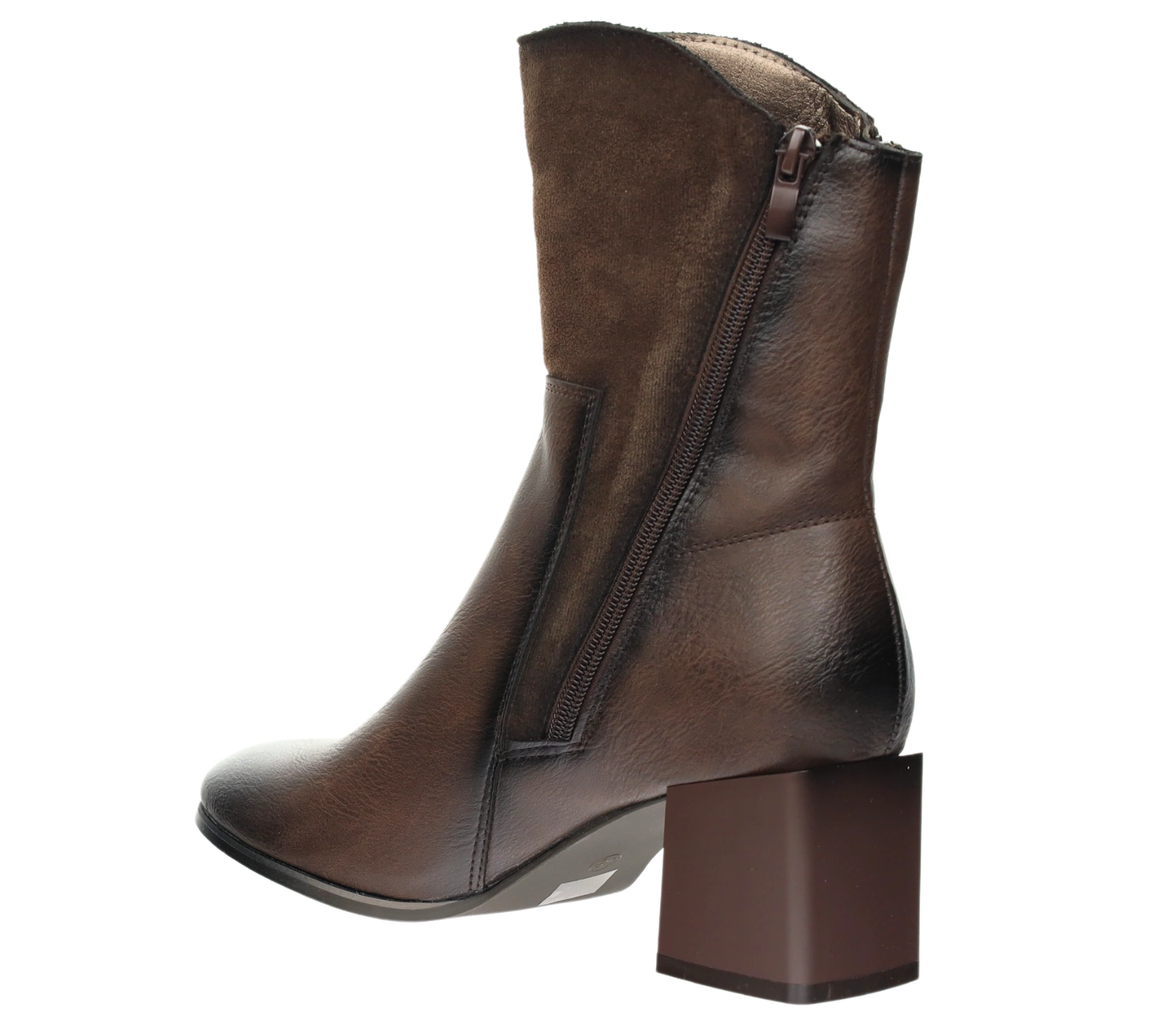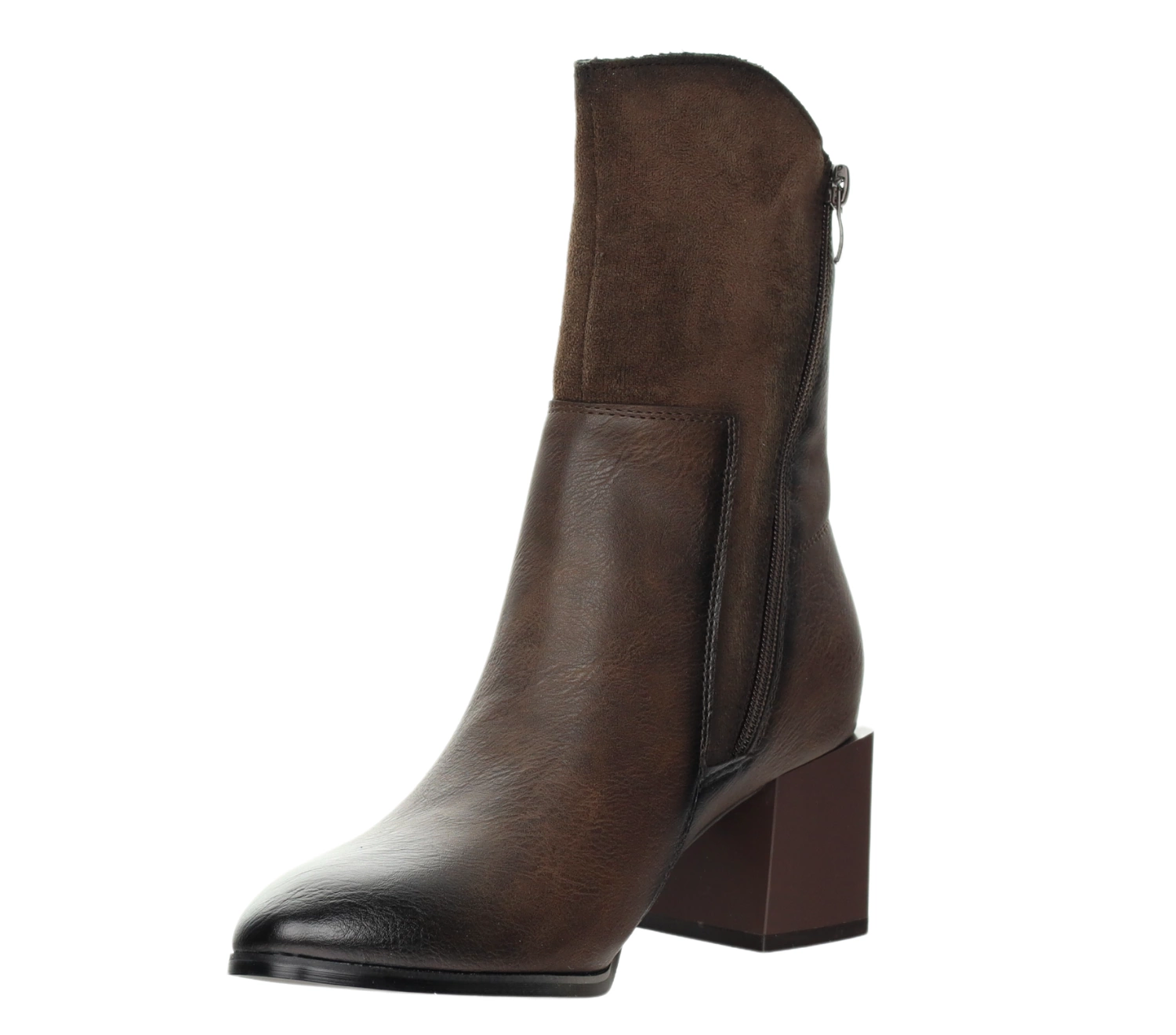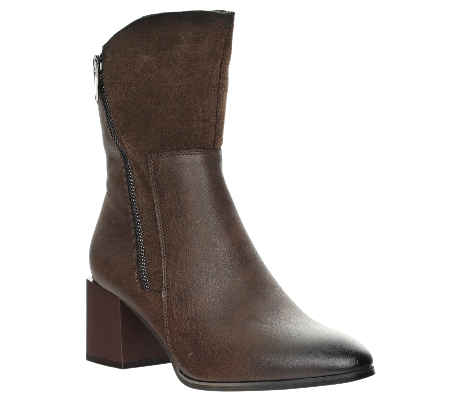Te eleganckie botki damskie to idealne połączenie wygody i szyku, doskonałe na zimowe dni. Wykonane z wysokiej jakości skóry ekologicznej w głębokim brązowym kolorze, wyróżniają się modnym połączeniem materiałów – dolna część buta z gładkiej skóry ekologicznej, a górna część z subtelnie zamszowym wykończeniem. Botki te dodadzą elegancji każdej stylizacji, zarówno casualowej, jak i bardziej formalnej.