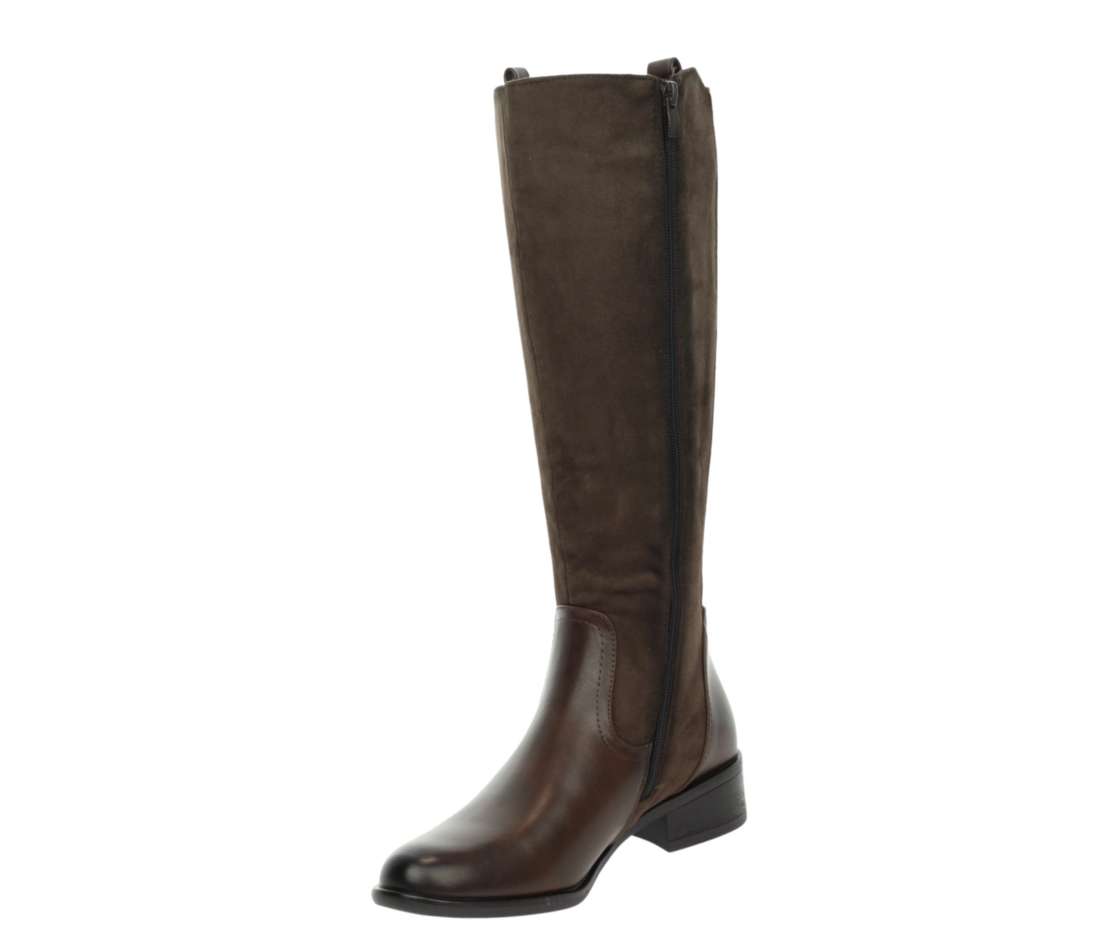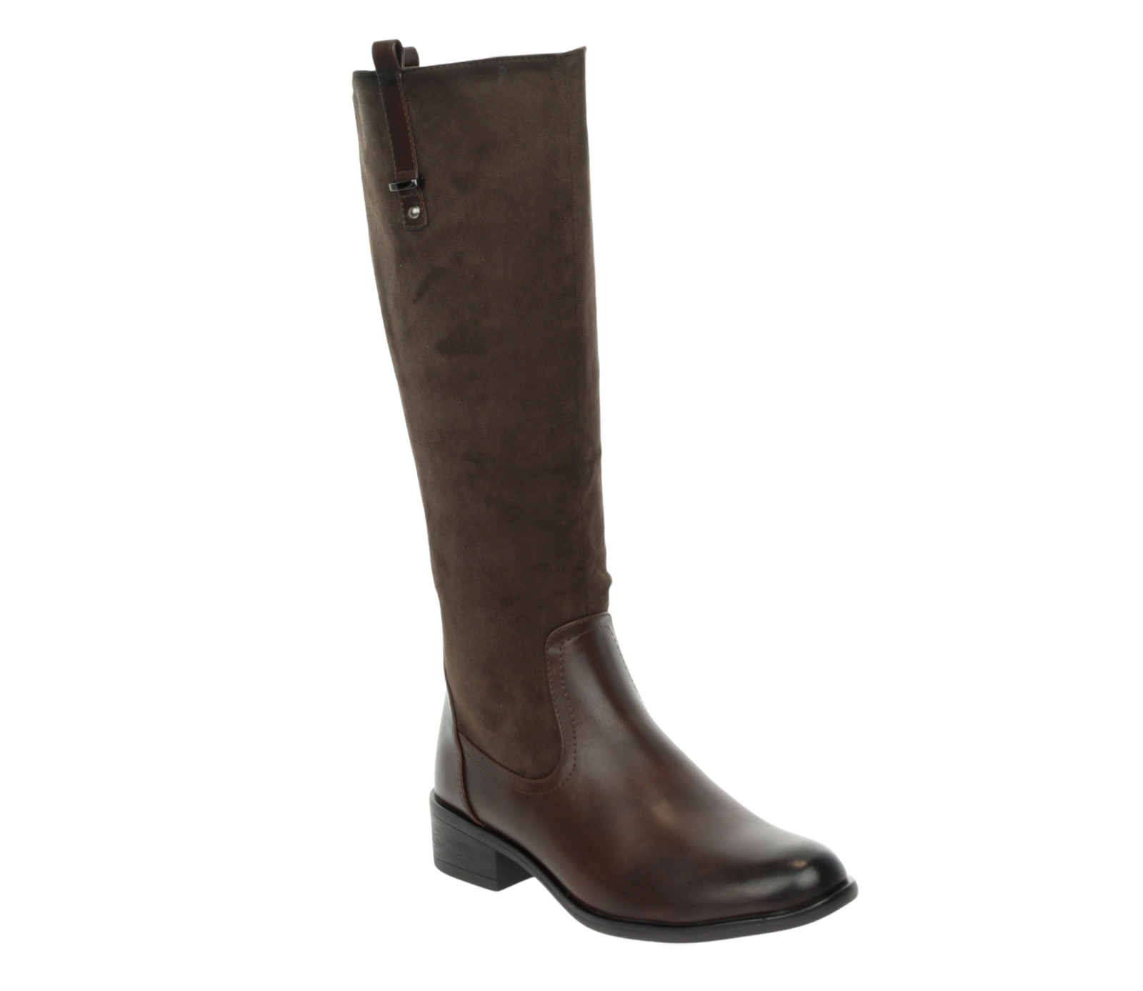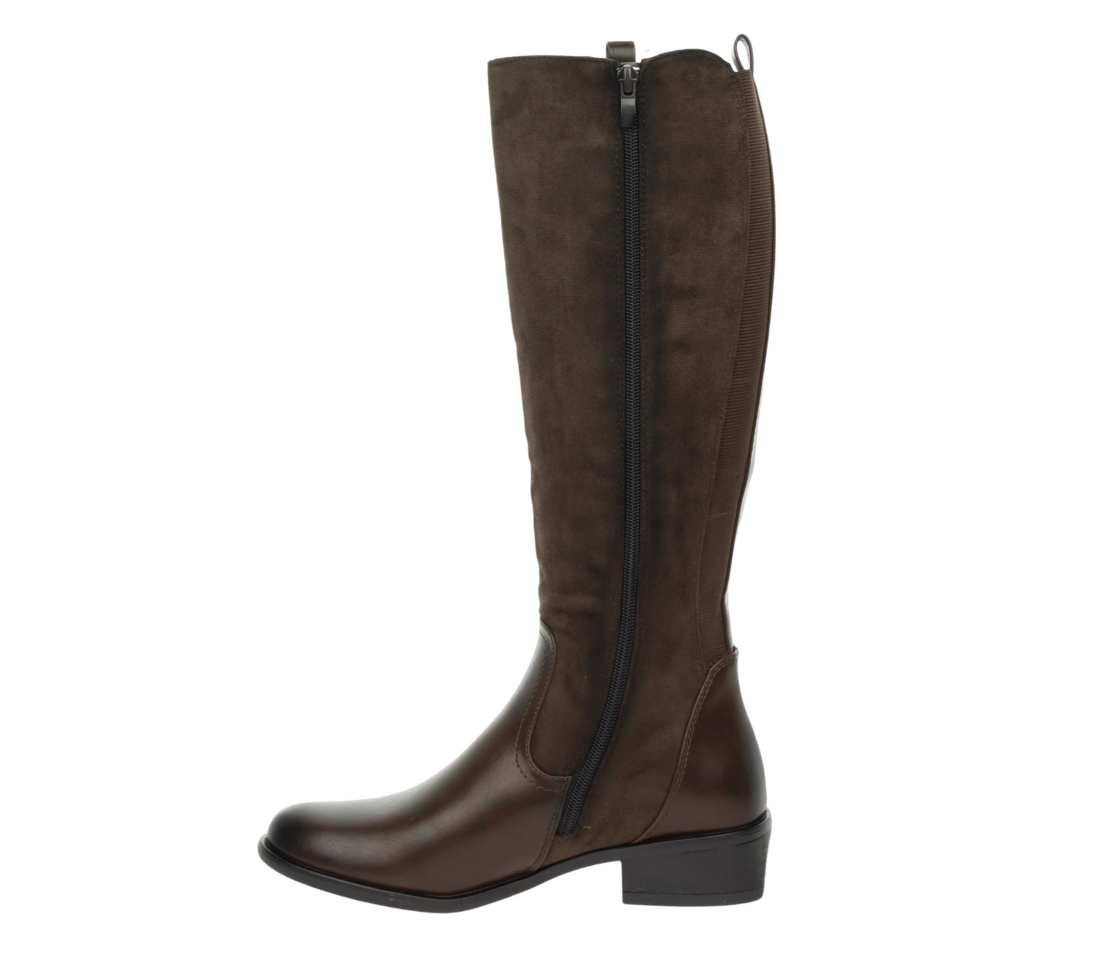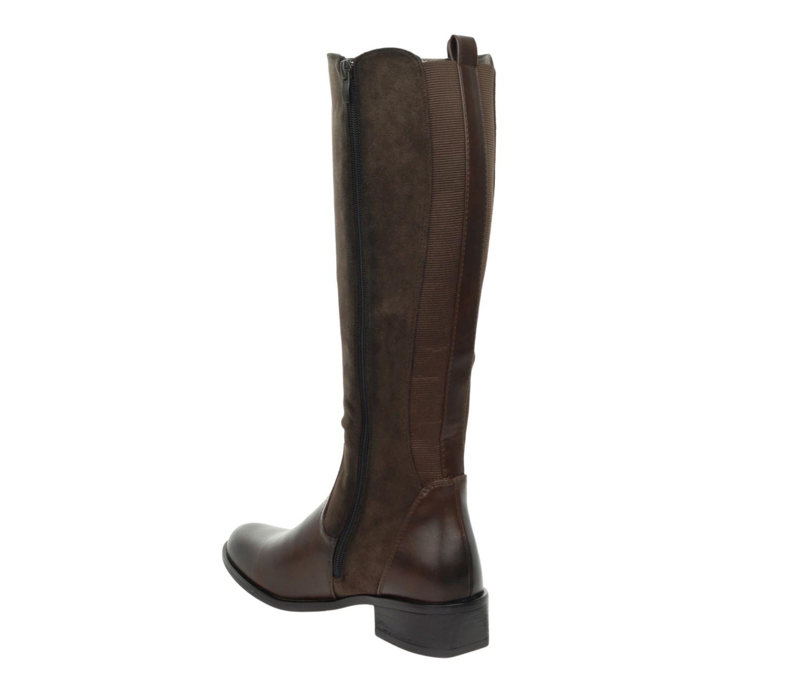 Zimowe kozaki damskie na płaskim obcasie eleganckie w kolorze ciemno brązowym. Płaskie kozaki damskie ocieplane z rozciągliwą cholewką na zamek.