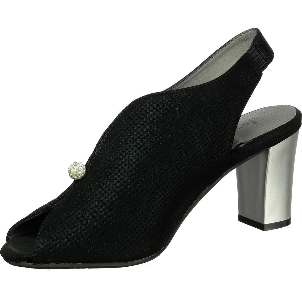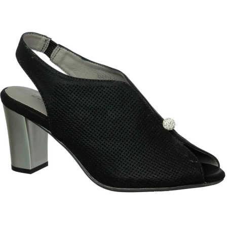 • Sandały na obcasie z zabudowaną cholewką oraz otwartym noskiem. Prosty krój cholewki dopełnia zdobienie w formie dużej cyrkonii. Skórzana wkładka, zapiętka elastyczna dzięki wszytej gumce.