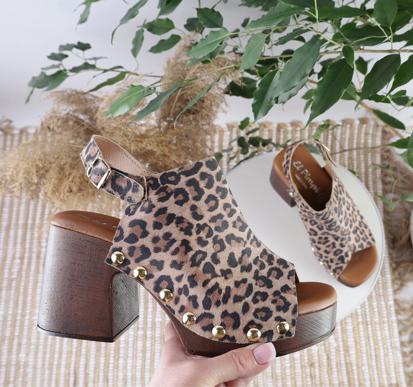 Sandały w panterkę na obcasie i platformie z ćwiekami Hiszpańskie El Pimpi