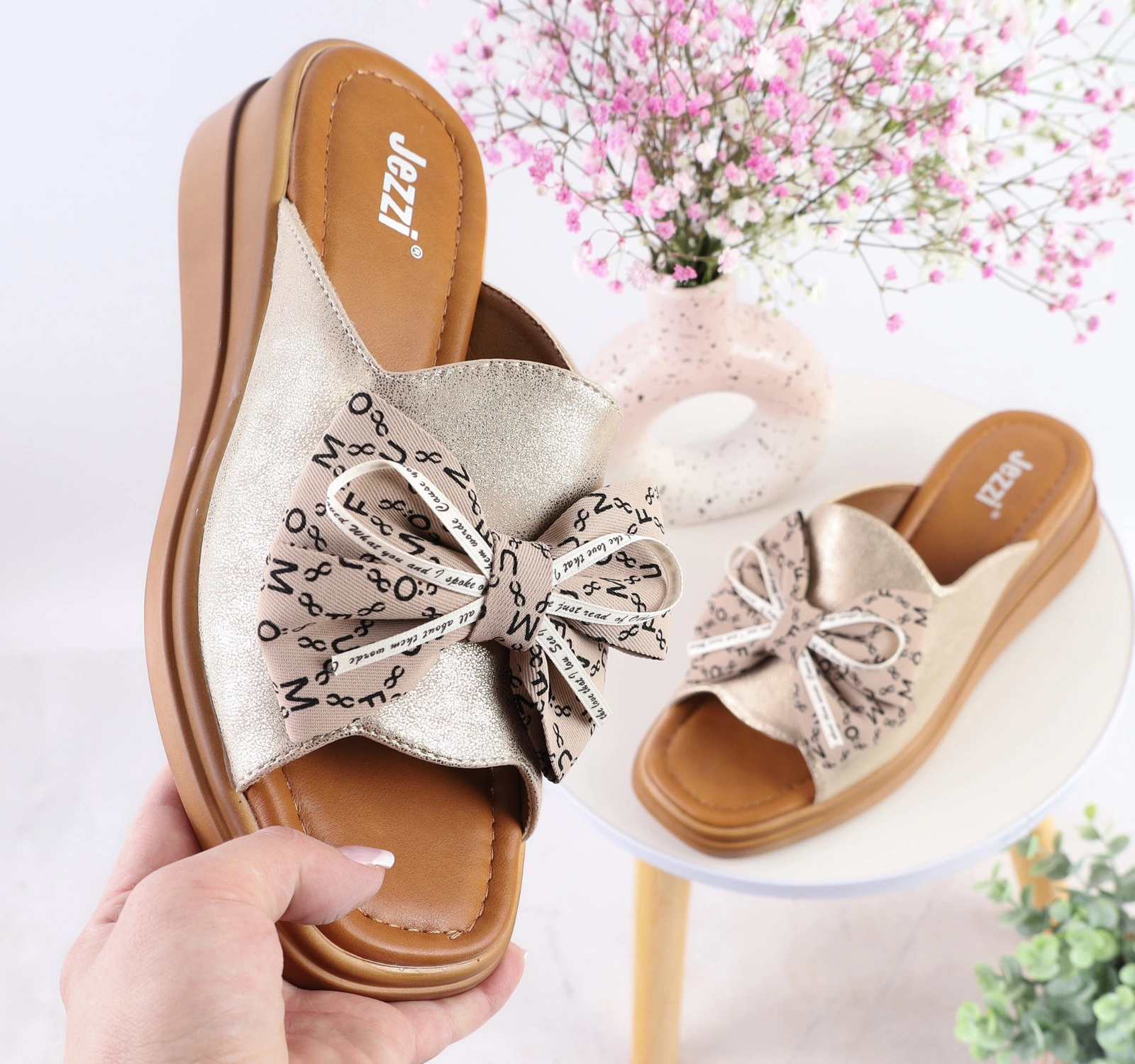 Eleganckie i wygodne klapki z kokardą na niskiej koturnie Jezzi