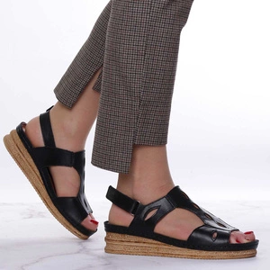 Czarne sandały skórzane damskie na lekkiej koturnie szyte Gino Fabiani - Produkt Polski